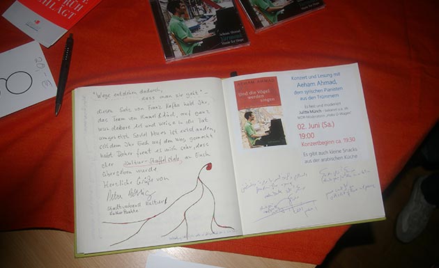 Die klug und einfühlsam ausgewählten Passagen aus seinem Buch – sensibel und lebendig vorgetragen von Julitta Münch – zeigen, dass er auch mit Worten und Bildern ein Künstler ist. Durch die vorgelesenen Episoden aus dem Buch, das trotz der traurigen Geschichte durchaus auch humorvoll ist, fühlte man sich ganz nah dran an dem Menschen Ahmad, konnte ihn und seine Musik verstehen und sich gleichzeitig ein Bild davon machen, wieviel Leid und Schmerz all diejenigen erlebt haben, die es vor drei Jahren mit der großen Flüchtlingswelle zu uns getragen hat und diejenigen, die immer noch in den Trümmern des Krieges leben.