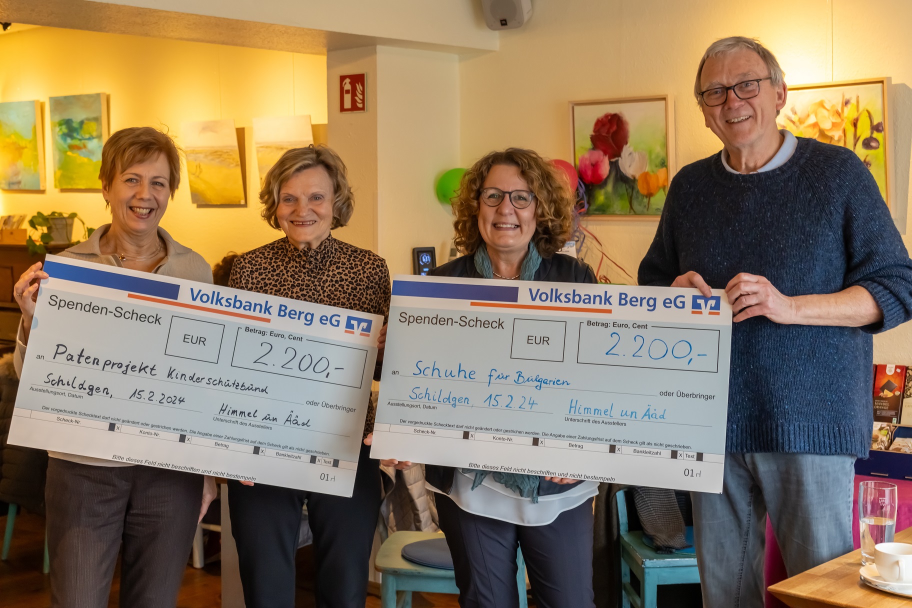 Anlässlich eines gemeinsamen Kaffeetrinkens und Austausches über die jeweiligen Projekte konnten Dagmar Ibe und Achim je 2.200,- Euro an Angelika Krell, Projektleiterin des „Patenprojektes“ des Kinderschutzbundes Rheinisch-Bergischer Kreis, und Hildegard Knoch-Will Vorständin des „Schuhe für Bulgarien e.V.“ überreichen. „Wir freuen uns sehr, dass wir diese beiden wichtigen Projekte hier vor