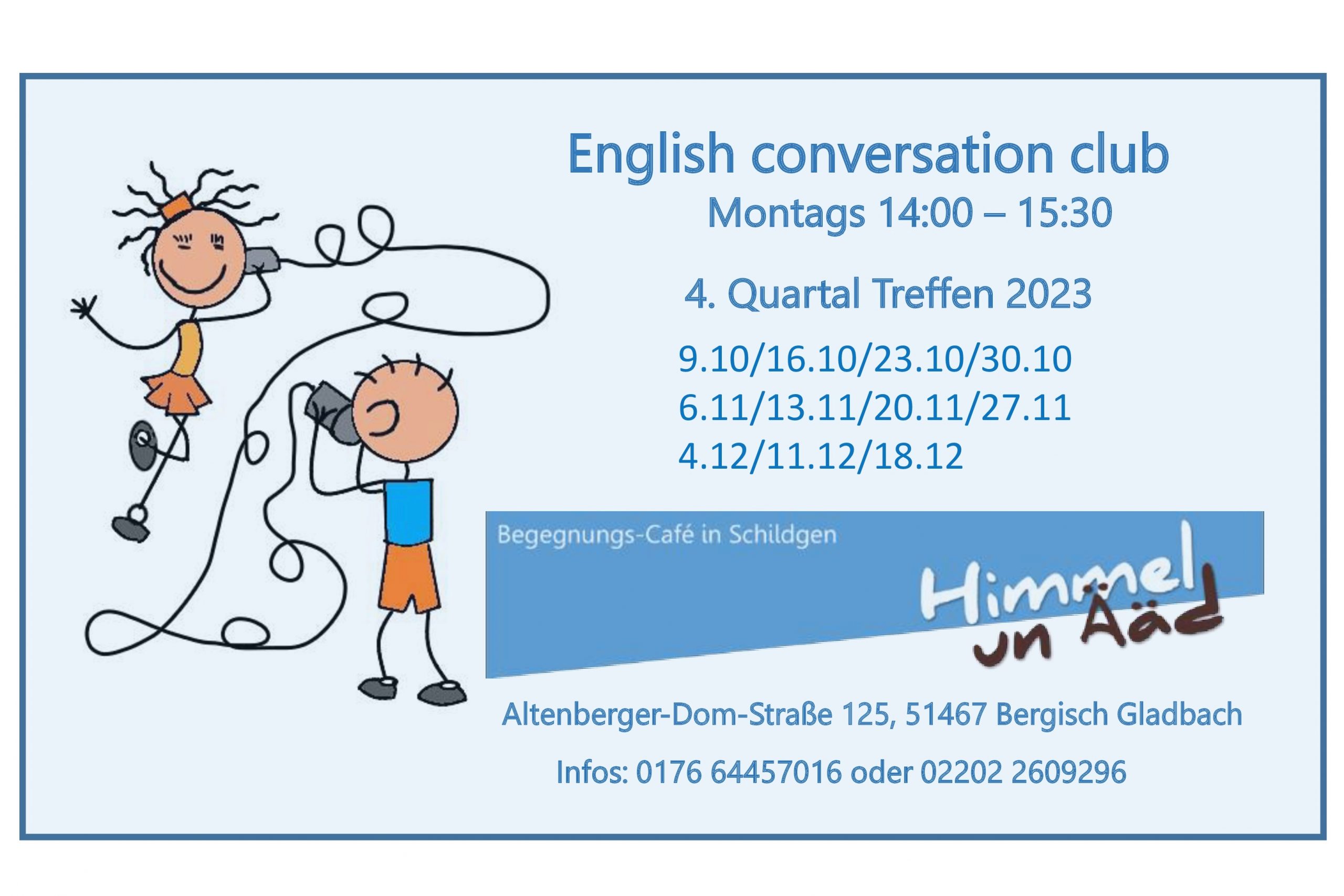 Ohne lästiges Lernen von Vokabeln u. Grammatik sprechen wir in kleiner Runde über Alltägliches, schulen u. verbessern unser Gehör und unsere Fähigkeiten in der englischen Sprache – mit Malcolm Shuttleworth (Englischlehrer und Muttersprachler aus Manchester, seit vielen Jahren in Deutschland mit sehr guten Deutschkenntnissen).