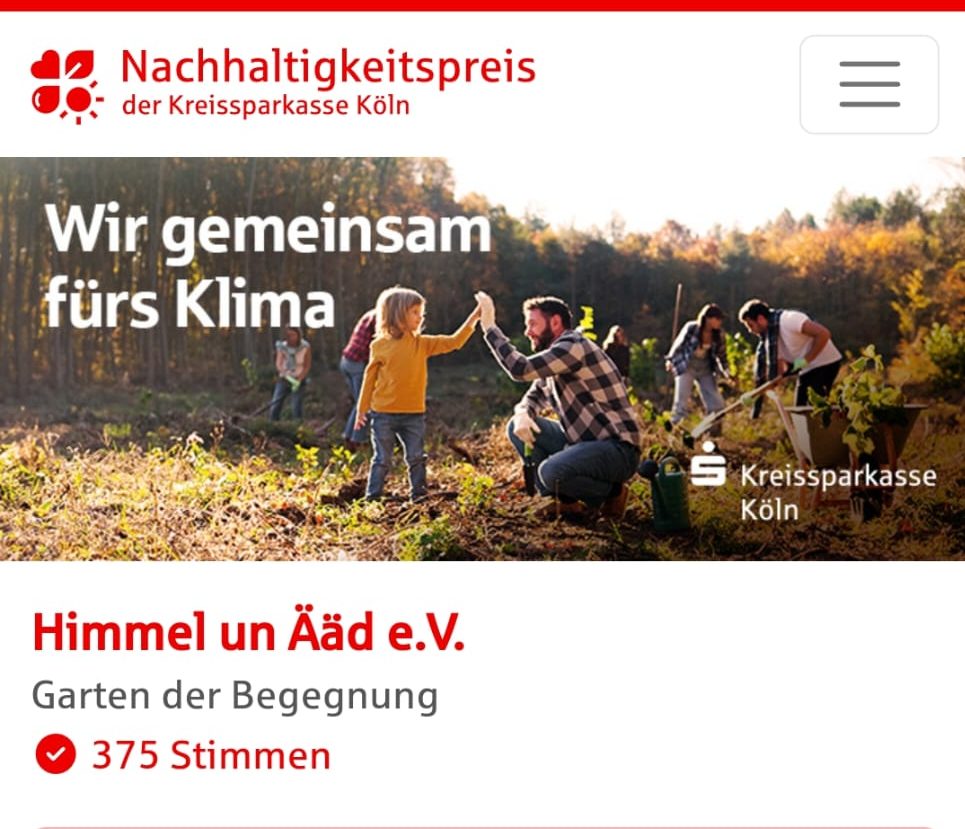 Im Abstimm-Marathon für den Nachhaltigkeitspreis der Kreissparkasse Köln im Rheinisch-Bergischen Kreis hat unser „Garten der Begegnung“ mit 375 Stimmen den anfangs von uns unerwarteten 8. Platz von 26 eingereichten – allesamt tollen und kreativen – Projekten gemacht