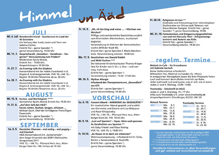 Vom 24.Juli – 11.August hat unser H&Ä-Begegnungscafé nur vormittags von 9:00 bis 13:00 geöffnet.