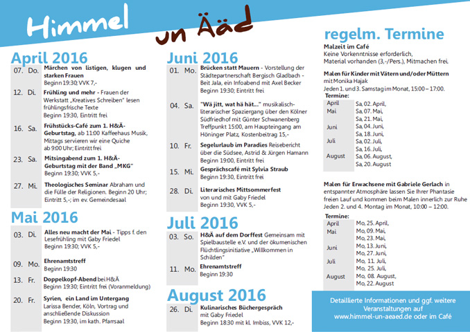 mit vielseitigem Programm: großes Mitsingkonzert, kölsch-musikalischer Spaziergang über den Südfriedhof, Gesprächsabende, Lesungen, Vorträge und vieles mehr.
