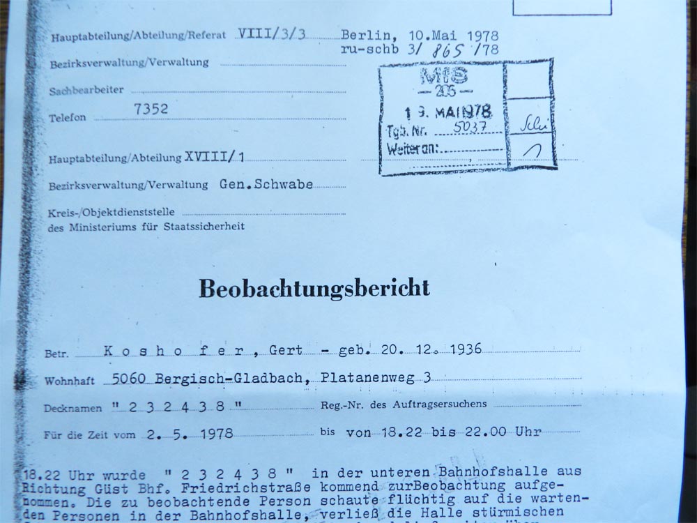 Aufgrund seiner diversen Kontakte in die DDR stand auch er unter „Beobachtung“. „Informationen zu K. lassen den begründeten Verdacht zu, dass K. in die Stützpunkttätigkeit der AGFA direkt einbezogen ist.“ so aus dem MfS – Übersichtsbogen zur operativen Personenkontrolle. Spannend formuliert auch der Beobachtungsbericht vom 10. Mai 1978: „18:22 Uhr wurde … Beobachtung aufgenommen. Die zu beobachtende Person schaute flüchtig auf die wartenden Personen, verließ die Halle stürmischen Schrittes …“.