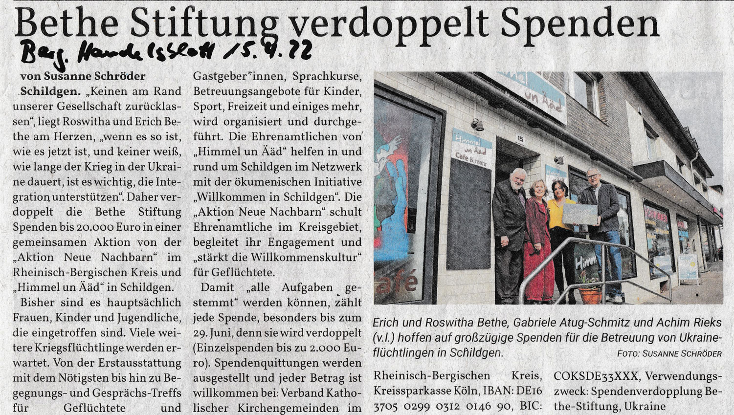 „Keinen am Rand unserer Gesellschaft zurücklassen“, liegt Roswitha und Erich Bethe am Herzen, „und wenn keiner weiß, wie lange der Krieg in der Ukraine dauert, ist es wichtig zu unterstützen“.