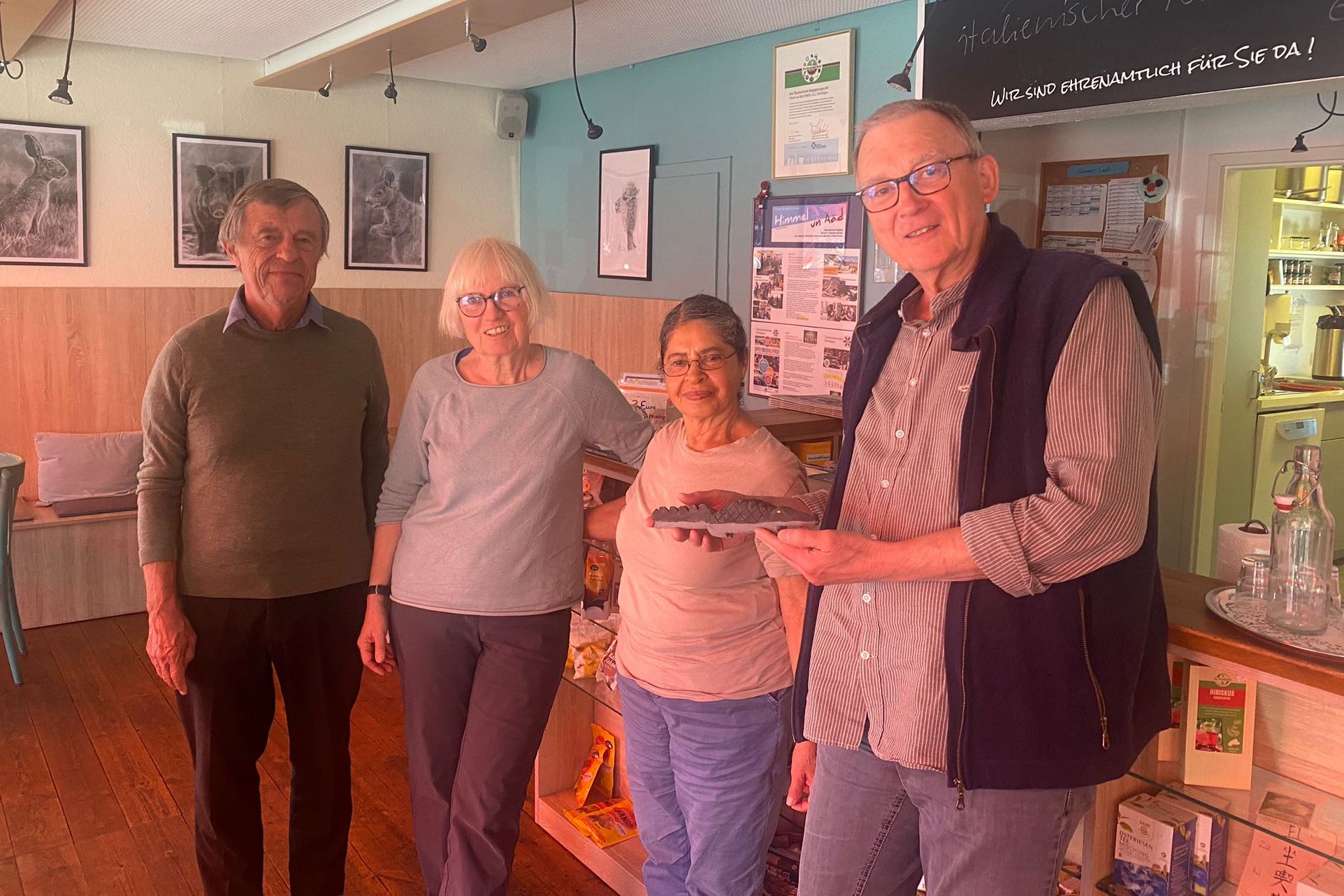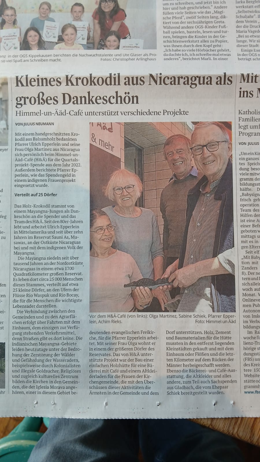 Pfarrer Ulrich Epperlein und seine Frau Olga Martinez aus Nicaragua besuchten uns heute spontan mit ihrer Bergisch Gladbacher Freundin Sabine Schiek im H&Ä-Café, um persönlich Danke zu sagen für unsere Quartalsprojekt-Spende aus 2022 (1.750 Euro) und um zu berichten, wie das Spendengeld in einem indigenen Frauenprojekt eingesetzt wurde.