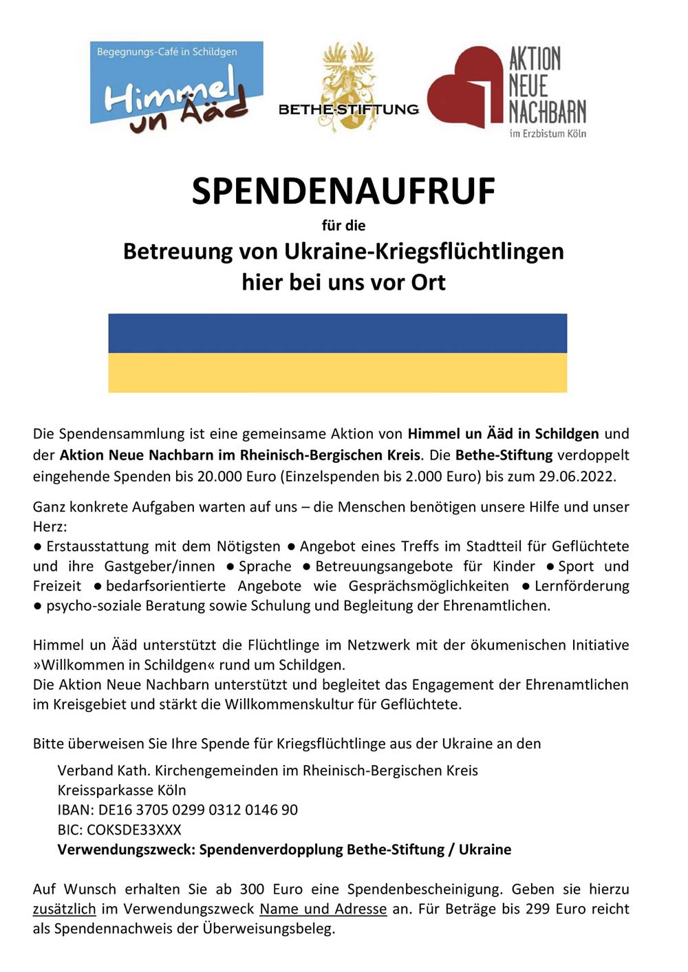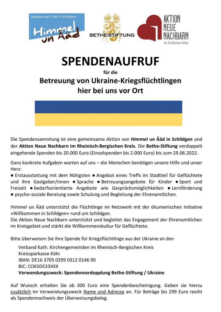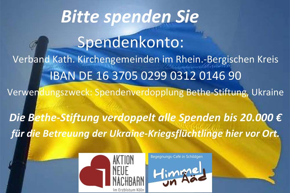 Die Bethe Stiftung verdoppelt Spenden bis 20.000 € in einer gemeinsamen Aktion von Himmel un Ääd und der Aktion Neue Nachbarn.