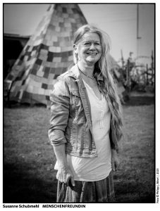 Die „Menschenfreundin“ Susanne Schubmehl steht wie eine Native American vor dem Tipi, das viele Menschen aus Schildgen in einer gemeinsamen Aktion gehäkelt und gestrickt haben.