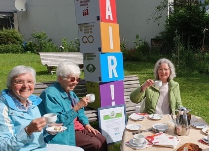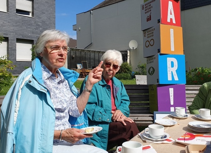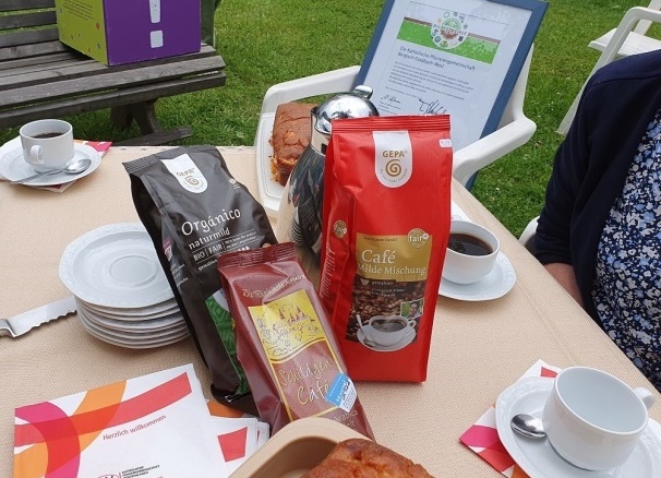 Nach ihrer wöchentlichen Wortgottesfeier trafen sich Ende Mai einige Frauen der kfd Herz Jesu Schildgen (Katholische Frauengemeinschaft) im Garten der Begegnung, um bei einem Tässchen fairen Kaffee und einem leckeren Stückchen Kuchen ihre schon seit einiger Zeit praktizierte Verwendung von fairem Kaffee bei ihren Zusammenkünften „offiziell“ zu besiegeln.Auch der sich regelmäßig Mittwoch nachmittags im Pfarrsaal treffende Seniorenkreis hat sich unter Leitung von Helga Feldhues dazu entschlossen, den fairen Gedanken praktisch zu unterstützen. „Nach einem kürzlichen Vortrag über faire Produkte und Informationen zu fairem Handel in unserer Seniorenrunde durch Susanne Schubmehl vom H&Ä-Café und Gabriele Apicella von der städtischen Steuerungsgruppe FAIRTRADE haben wir uns auch gerne dazu entschlossen, im Rahmen unseres Seniorencafés auf fairen Kaffee umzusteigen, den wir im Himmel un Ääd-Café kaufen. Unseren Seniorinnen und Senioren schmeckt der Kaffee sehr gut und wir freuen uns, die wirklich gute und wichtige Sache mit unseren kleinen Möglichkeiten zu unterstützen.“, so Helga Feldhues.