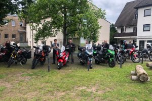 Es ist 11:30 und pünktlich rollen schon mal 6 Teilnehmer der Motorradexerzitien im Bistum Köln an, um hinter der Herz-Jesu-Kirche zu parken. Eine halbe Stunde später kommen die nächsten 6 Motorräder um die Ecke.