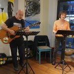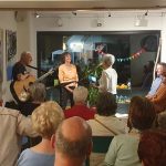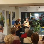 Und dieser Beginn zeigt schon ein wenig, wie die SongLesung funktioniert: Petra Christine Schiefer trug ihre zum Teil textnahen, zum Teil freien Übertragungen aus der Songliteratur der Babyboomer-Generation vor, Winfried Bode präsentierte stimmgewaltig seine mitreißenden Coverversionen: Von „Morning has broken“ über „Blue suede shoes“ bis „Imagine“ war sehr Vieles von dem dabei, was diese Generation begleitet hat. Stilgemischt und variantenreich wurden Original und Übersetzung manchmal verwoben, gemeinsam gesungen, aufeinander bezogen. Und viele Gesichter im zahlreichen Publikum spiegelten die Freude des Wiedererkennens.