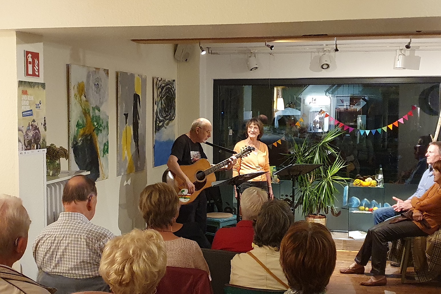 Und dieser Beginn zeigt schon ein wenig, wie die SongLesung funktioniert: Petra Christine Schiefer trug ihre zum Teil textnahen, zum Teil freien Übertragungen aus der Songliteratur der Babyboomer-Generation vor, Winfried Bode präsentierte stimmgewaltig seine mitreißenden Coverversionen: Von „Morning has broken“ über „Blue suede shoes“ bis „Imagine“ war sehr Vieles von dem dabei, was diese Generation begleitet hat. Stilgemischt und variantenreich wurden Original und Übersetzung manchmal verwoben, gemeinsam gesungen, aufeinander bezogen. Und viele Gesichter im zahlreichen Publikum spiegelten die Freude des Wiedererkennens.