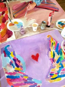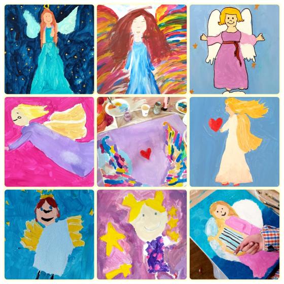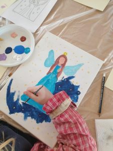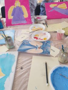 Danach wurden die Skizzen auf Leinwände übertragen und mit Acrylfarben ausgemalt. Es sind viele tolle und bunte Schutzengel entstanden.