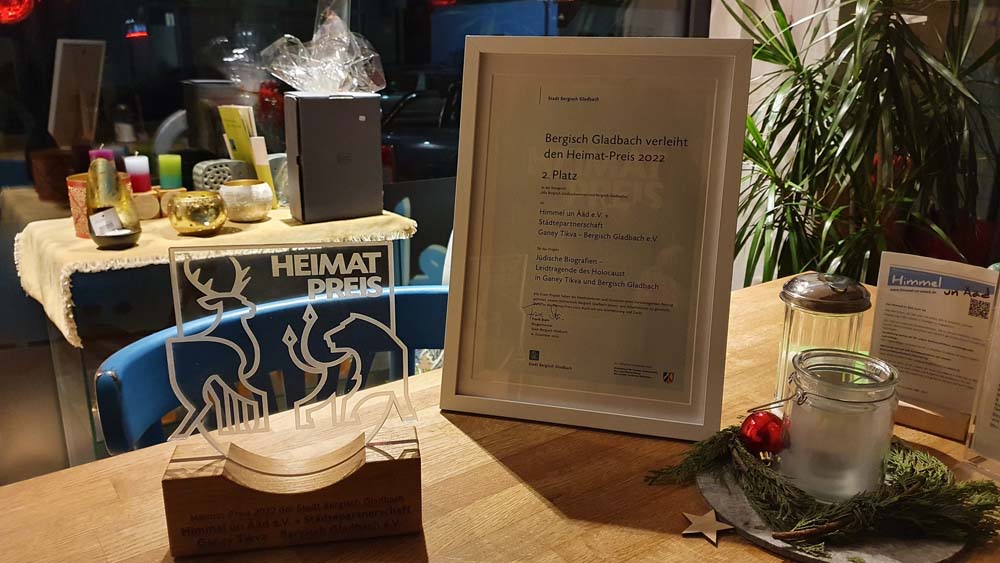 Nachmittags wurde uns und dem Ganey Tikva Städtepartnerschaftsverein im Rathaus in einer kleinen Feierstunde die Urkunde zum 2. Platz beim „Heimatpreis 2022“ für unser Kooperationsprojekt „Jüdische Biografien in Ganey Tikva und Bergisch Gladbach“ überreicht.