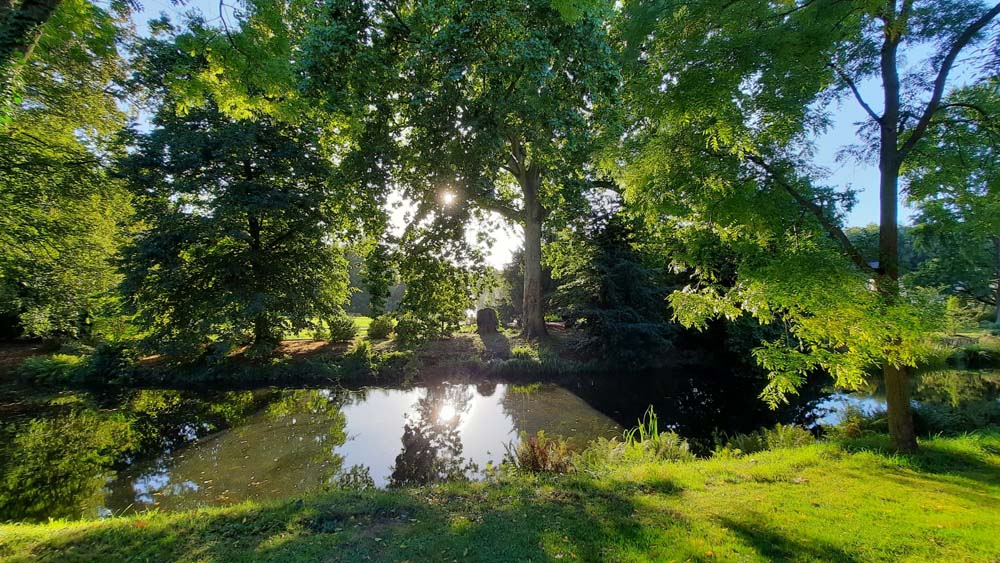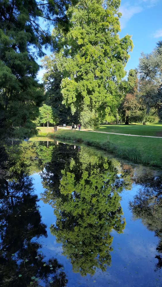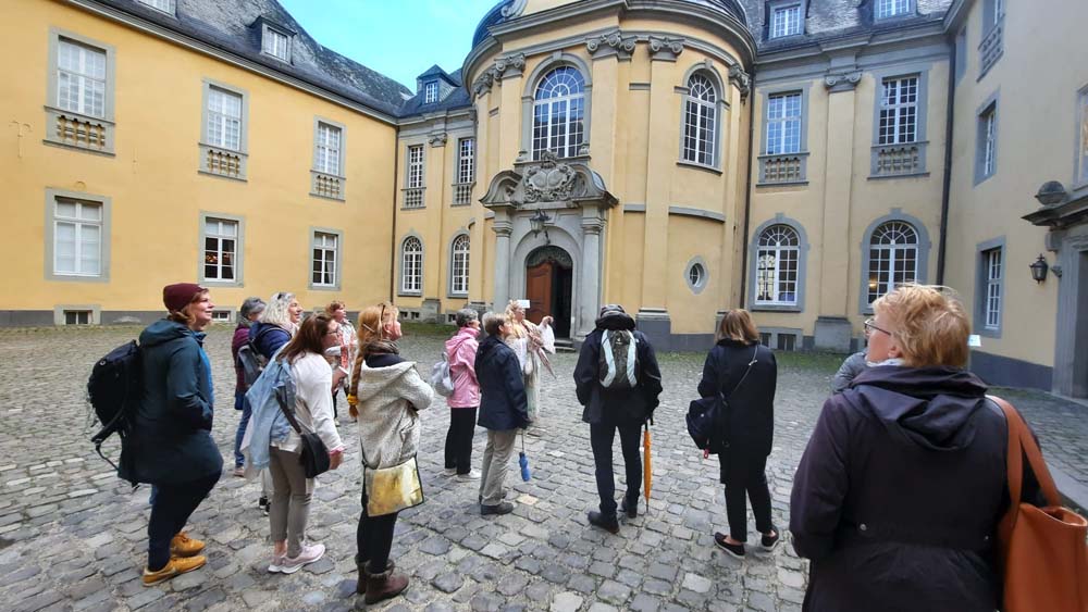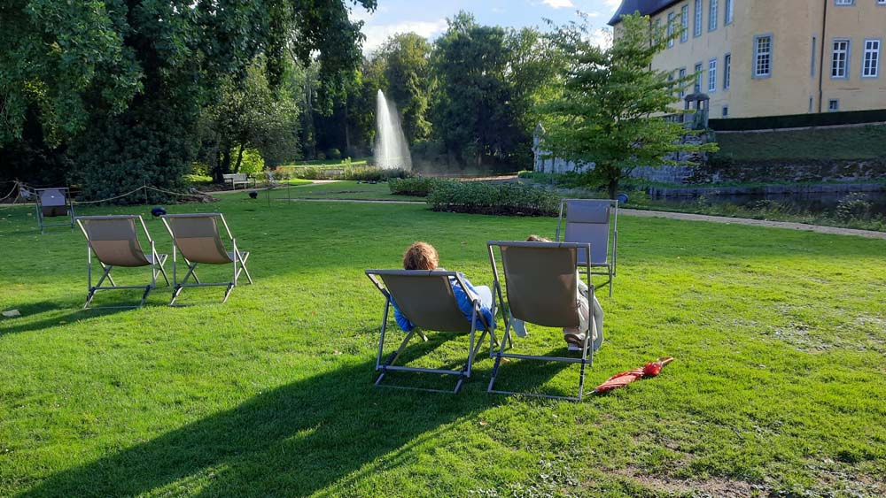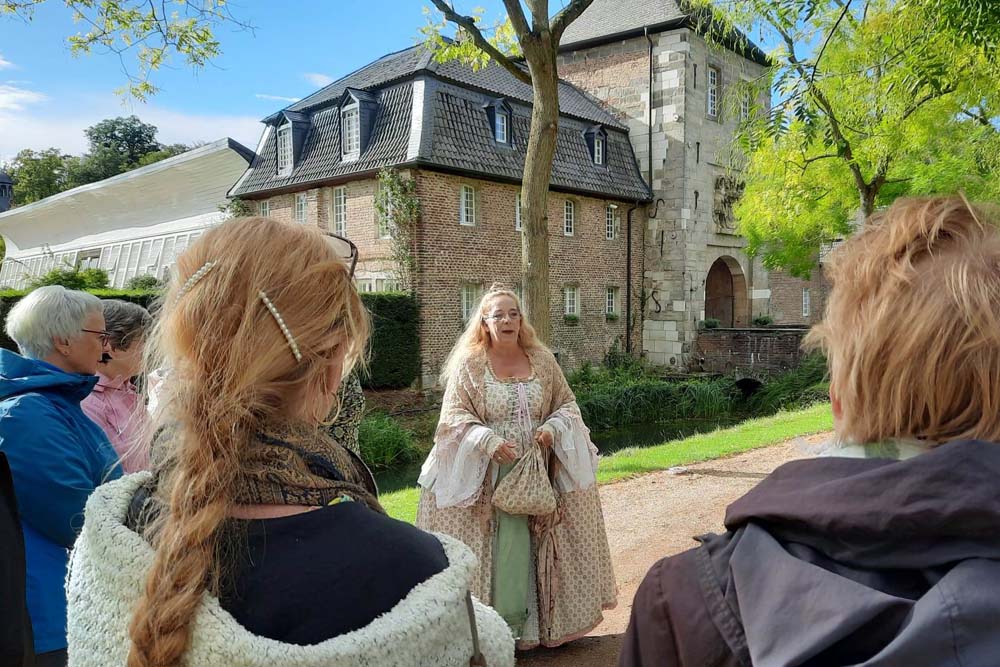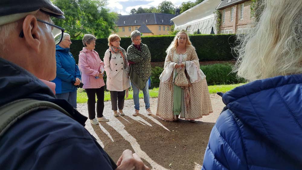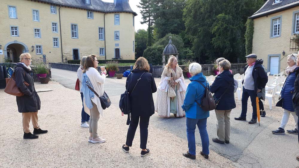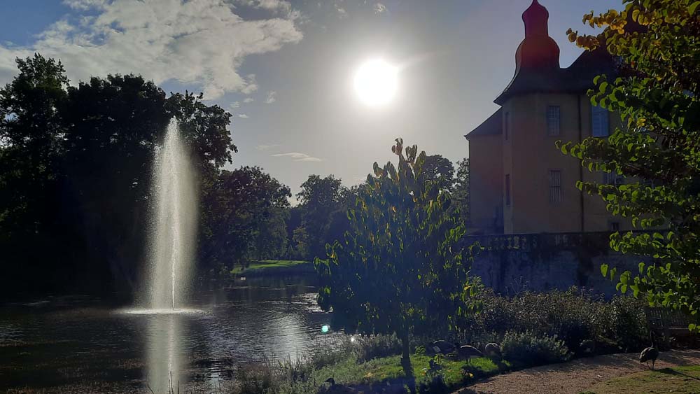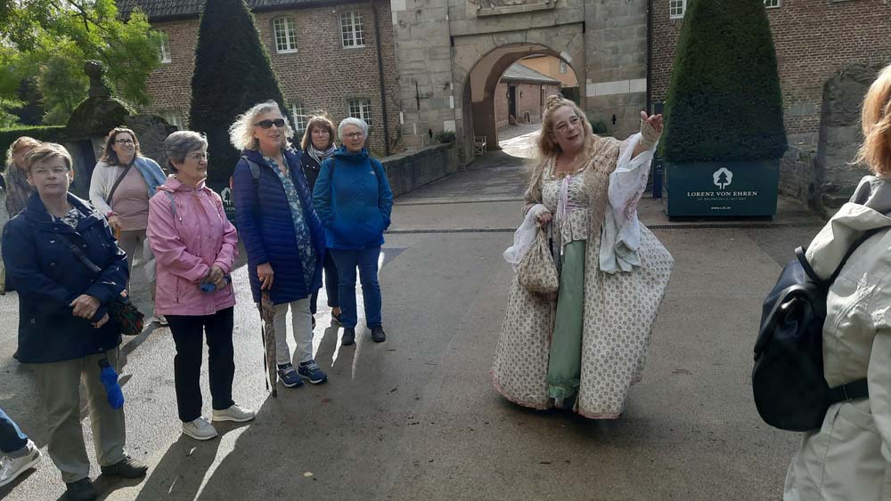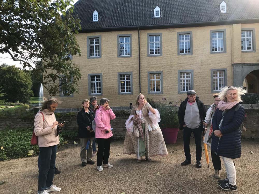 Das am frühen Nachmittag des 16. September herrschende kühle und windige Regenwetter war kein gutes Omen für ein erfolgreiches Gelingen unseres traditionellen Dankeschönausfluges, zu dem wir nach über dreijähriger Corona-Pause mit fünfunddreißig Ehrenamtlerinnen und Ehrenamtlern aufbrachen. Diesmal besuchten wir das barocke Wasserschloss Dyck mit seinen großartigen englischen Parkanlagen in der Nähe von Neuss. Doch was für eine Überraschung: kaum am Schloss angekommen, verzogen sich die Wolken und wir genossen einen herrlichen Nachmittag und Abend bei spätsommerlichem Sonnenschein: wenn Engel reisen…..!