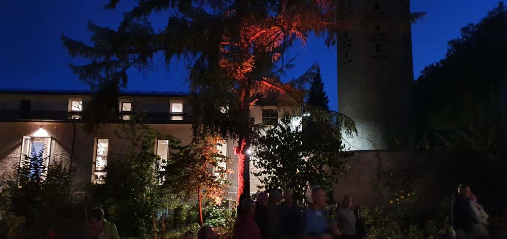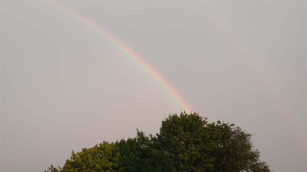 Zunächst pünktlich mit Konzertbeginn der langersehnte Regen – der Pfarrsaal bot den ausdauernden Gästen Asyl – dann der Regenbogen und dann ein wunderbares Konzert.