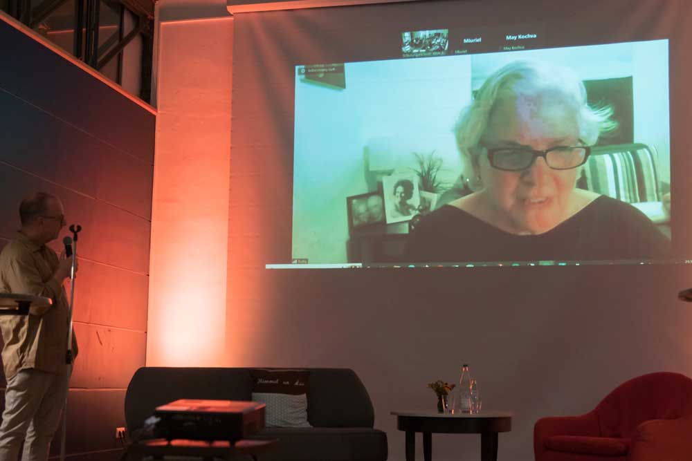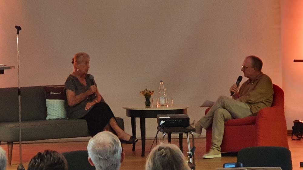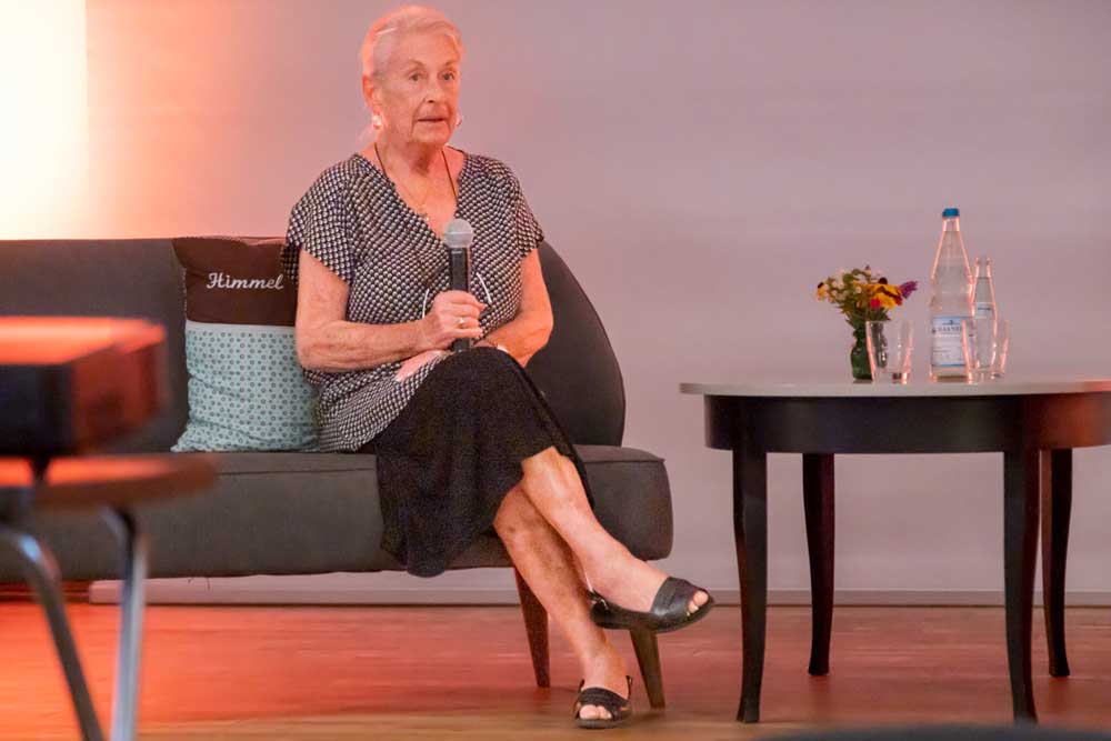 Zunächst nahm Ursula Völkner auf dem kleinen Sofa in der Mitte der Bühne Platz. Ihr Großvater, Dr. Erich Deutsch, wurde in das KZ Theresienstadt deportiert und dort erschlagen. Tom Hegermann entlockte Ursula Völkner einige Erinnerungen an ihre Mutter, Ilse Edelmann. Diese war von ihren Erfahrungen als Halbjüdin in Nazi-Deutschland so verunsichert, dass sie der Tochter erst von ihrem jüdischen Erbe erzählte, als diese 16 Jahre alt war. Ilse Edelmann war mit Tochter Ursula nach dem Kriegsende in Bergisch Gladbach geblieben, obwohl sie dort Gefahr lief, ihre Peiniger zu treffen – was leider auch geschah. Sie wählte aber Bergisch Gladbach vor allem als Heimatort, weil sie hier in Politik und Gesellschaft ihren Beitrag zu einem besseren Deutschland leisten wollte. Auch Ursula Völkner engagiert sich bis heute aus dem gleichen Grund im sozialen Bereich. Sie fürchtet – gerade vor dem Hintergrund ihrer Familiengeschichte – die Verrohung der Gesellschaft durch Respektlosigkeit, Intoleranz und Hass, besonders auch in den sozialen Netzwerken.