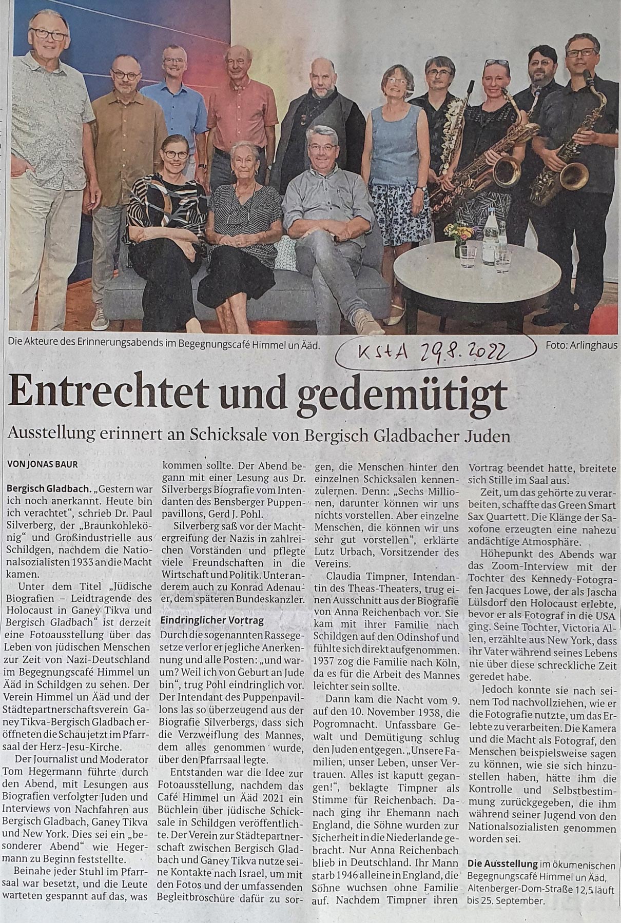 Danke Tom Hegermann, danke Claudia Timpner und Gerd Pohl für die ins Mark gehenden Lesebeiträge, danke dem Green Smart Sax Quartett, danke Ursula Völkner für das sehr persönliche Interview über ihren in Theresienstadt ermordeten Großvater Dr. Erich Deutsch aus Schildgen, danke Victoria Allen (Tochter von Jascha Lülsdorf/Jaques Lowe) in New York und Ruthy Vortrefflich (Tochter von David und Martha Vortrefflich) in Ganey Tikva für die Live-Online-Interviews in unsere Veranstaltung.