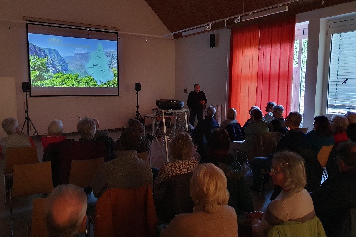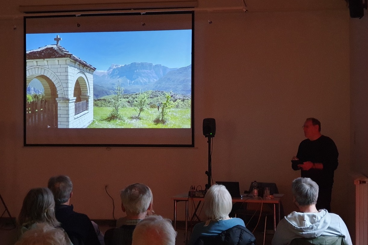 Lothar Hoppen nahm die Gästeschar im Gemeindesaal der Andreaskirche mit auf große Fahrt in den Nordwesten Griechenlands. Fachkundig und unterhaltsam brachte er seiner Zuhörerschaft Landschaft, Menschen, Kultur und Geschichte dieser atemberaubenden Region und ihrer kleinen, oftmals zwischen den Bergen versteckten Dörfern nahe.