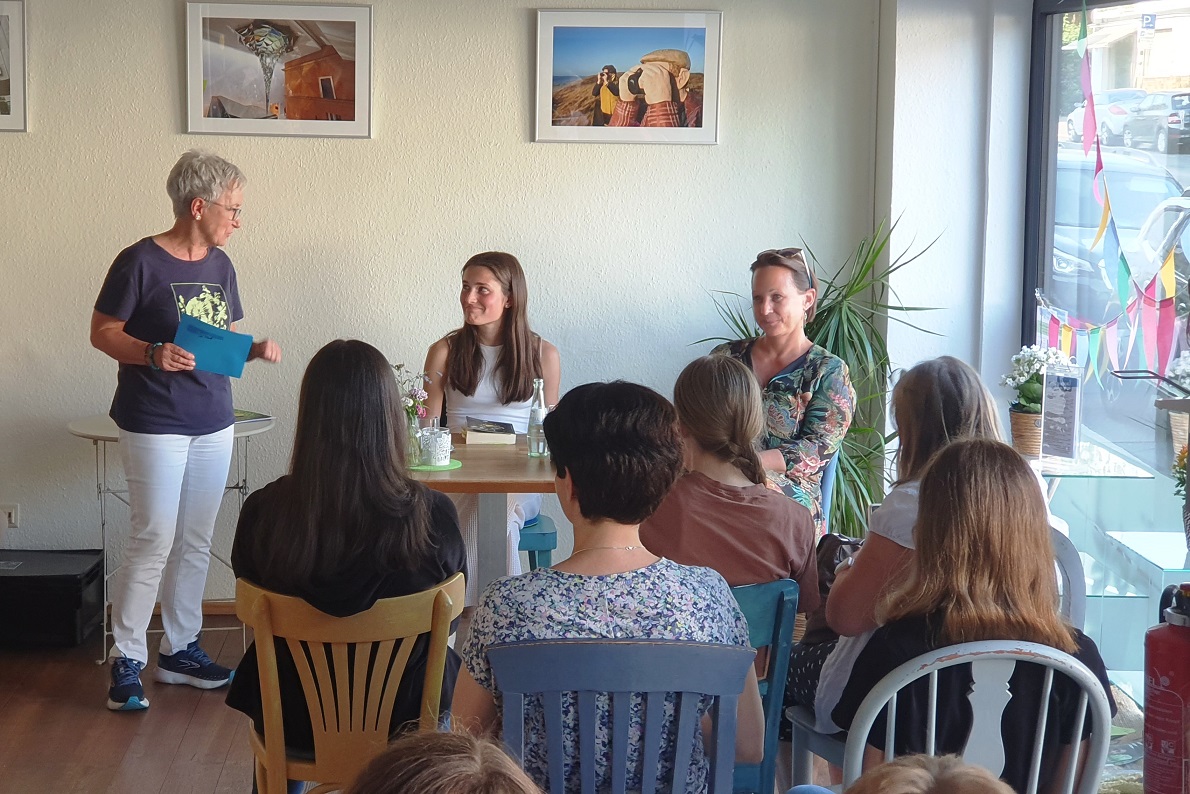 „Es war ein großartiger Abend mit guten Gesprächen und einem Zusammenkommen von Literaturbegeisterten jeden Alters. Mir hat es viel Freude bereitet, für das Publikum zu lesen, die Atmosphäre und das Setting waren wunderbar. Gerne komme ich wieder ins Himmel un Ääd-Café“ (Kiana Haas).