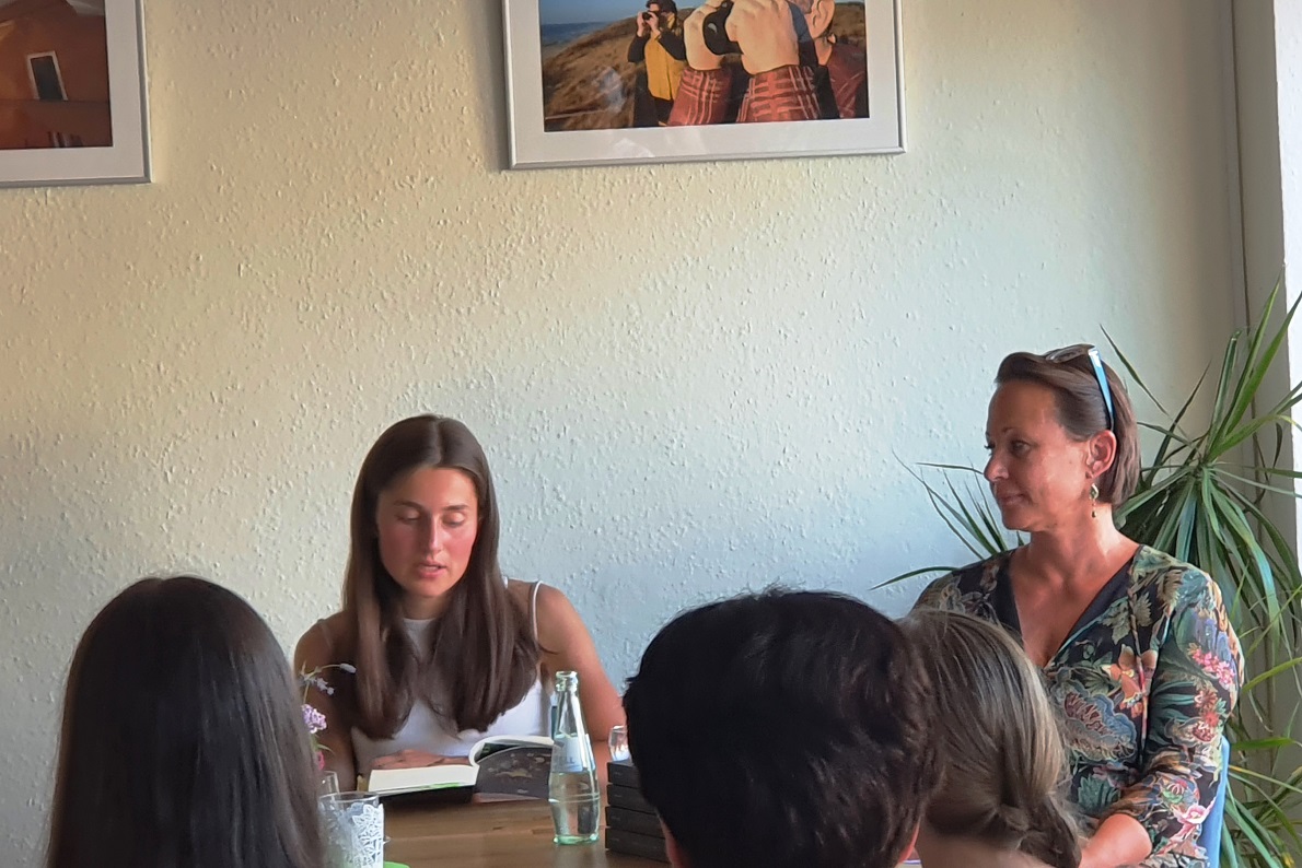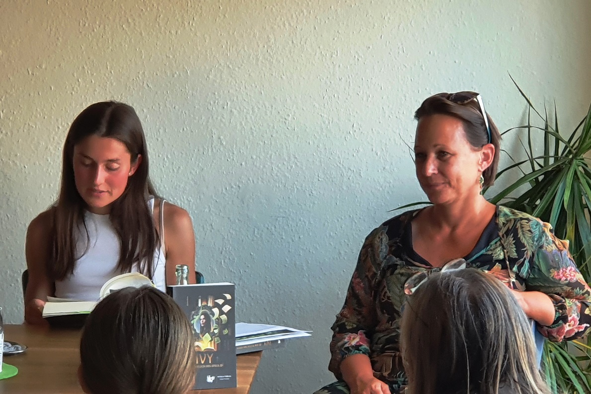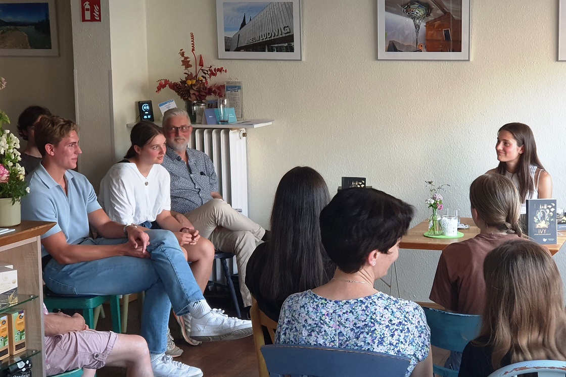 Im Anschluss an die Lesung gab es noch einen regen Austausch mit Kiana. So haben die Zuhörer:innen auch erfahren, wie sie mit Unterstützung des Scylla-Verlages ihren kreativen und erfolgreichen Schreibweg gefunden hat und wie sie es schafft, neben ihren alltäglichen Herausforderungen mit Lernen, Sport, Freizeit, Freunde und Familie, Zeit für ihre Ideen und fürs Schreiben zu finden. Auch wurde sie gefragt, ob die Geschichte eine Fortsetzung findet. Ja, soviel wurde verraten, geschrieben ist sie bereits, aber noch im Lektorat. Begleitet wurde Kiana von Nicola Henselmann vom Scylla-Verlag.