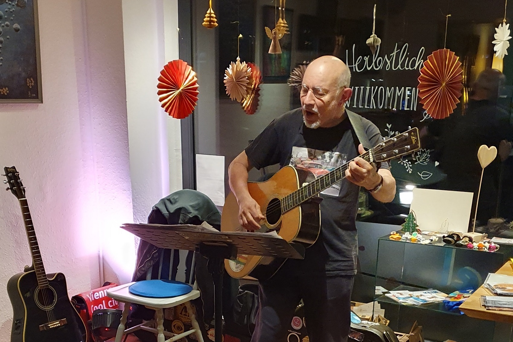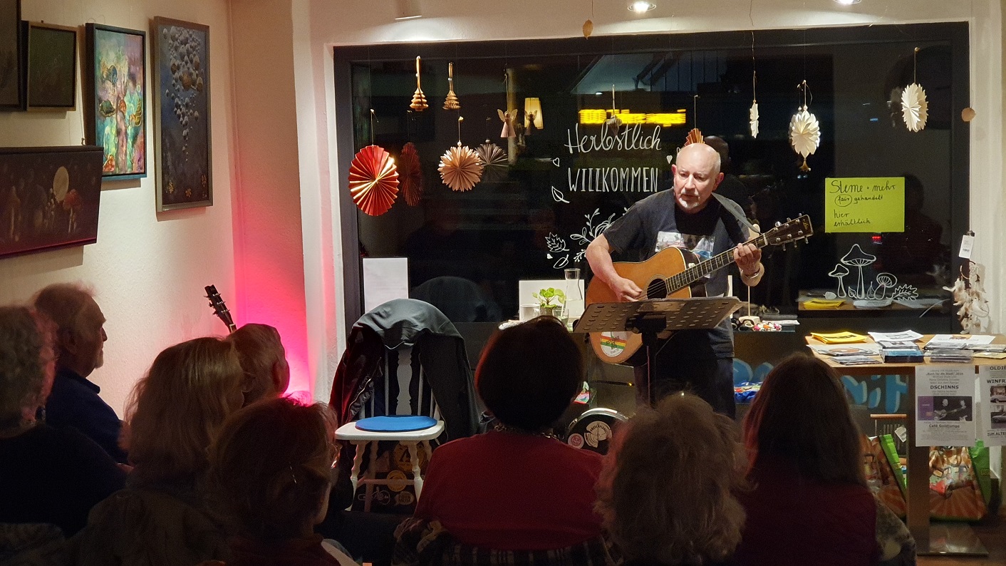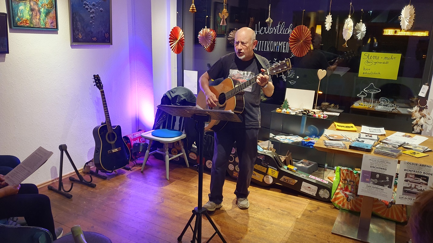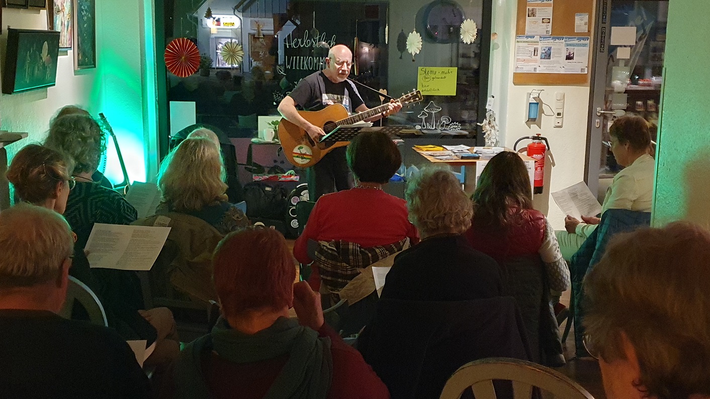 Der Mitsingabend mit dem Kölner Sänger und Gitarristen Winfried Bode hat mal wieder viel Freude und Spaß am Singen gemacht. Kräftig wurden die Songs der 50er und 60er mitgesungen – Titel von Mary Hopkin, Kris Kristofferson, Cliff Richard & The Shadows über Cat Stevens, Elvis Presley bis hin zu Hoffmann von Fallersleben – Pop-Hits, Country, Folk, Rock `n‘ Roll, Beat, Protestlieder, charmant-witzige Schlager, swingendes Easy Listening, dramatische Balladen.