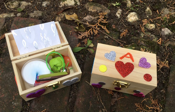 Die Kinder entdeckten die „Böhm-Kirche“ spielerisch: auf Schatzsuche machte sich eine kleine Gruppe von Kindern zwischen 3 und 8 Jahren mit ihren Eltern. Ausgestattet mit Schatzkisten, die sich über die Zeit füllten, gingen die Kinder auf Entdeckungsreise. So konnten sie z. B. die großen Kirchenglocken zum Läuten bringen, haben erfahren, warum die Osterkerze eine ganz besondere ist und mit Knete kleine Kunstwerke geformt, so wie Gottfried Böhm auch Modelle seiner Bauwerke modelliert hat. Im „Paradies“ hatten sich kleine Fische als Symbol für die Taufe versteckt und die Kinder haben entdeckt, dass der Fisch früher ein „Geheimzeichen“ der Christen war. Zum Abschluss konnten es sich die Familien rund um das Wasser gemütlich machen und die Schatzkisten voller Schätze noch von außen verzieren.