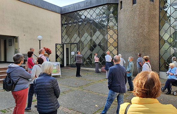 Wo beginnt man einen Rundgang durch die „Böhm-Kirche“ in Schildgen? Der Archtekturhistoriker Dr. Alexander Kierdorf bat am „Tag des offenen Denkmals“ zum Auftakt seiner Führungen zunächst auf den Bolzplatz hinter der Kirche: auf dem Weg dorthin hatten die Besucher nicht nur Gelegenheit, die trutzige, meterhohe Mauer von allen Seiten in Augenschein zu nehmen. Von dort ist auch der Blick frei auf die Vorgängerkirche, die heute als Pfarrsaal Teil des Ensembles der neuen Herz-Jesu-Kirche ist.