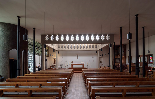 Warum ein aufstrebender und nachgerade wagemutiger Architekt wie Gottfried Böhm, Sohn immerhin des berühmten Architekten und Kirchenbauers Dominikus Böhm, hier überhaupt eine Kirche plante, die auch 60 Jahre nach ihrem Bau weiterhin als architektonisch wegweisend gelten darf, dafür hatte der versierte Lokalhistoriker eine Erklärung: die Bayer-Manager, die sich hier in Schildgen, vor den Toren von Leverkusen, ihre Häuser bauen ließen, hatten zuvor in aller Welt nicht nur Aspirin verkauft, sondern auch moderne Architektur kennen- und schätzen gelernt. So hielt avantgardistischer Geist auch Einzug ins beschauliche Schildgen und ebnete den Weg für einen „katholischen“ Kirchenbau, der mit Türmchen, Hütchen und jeder Menge Sichtbeton bis heute aus dem Rahmen fällt.