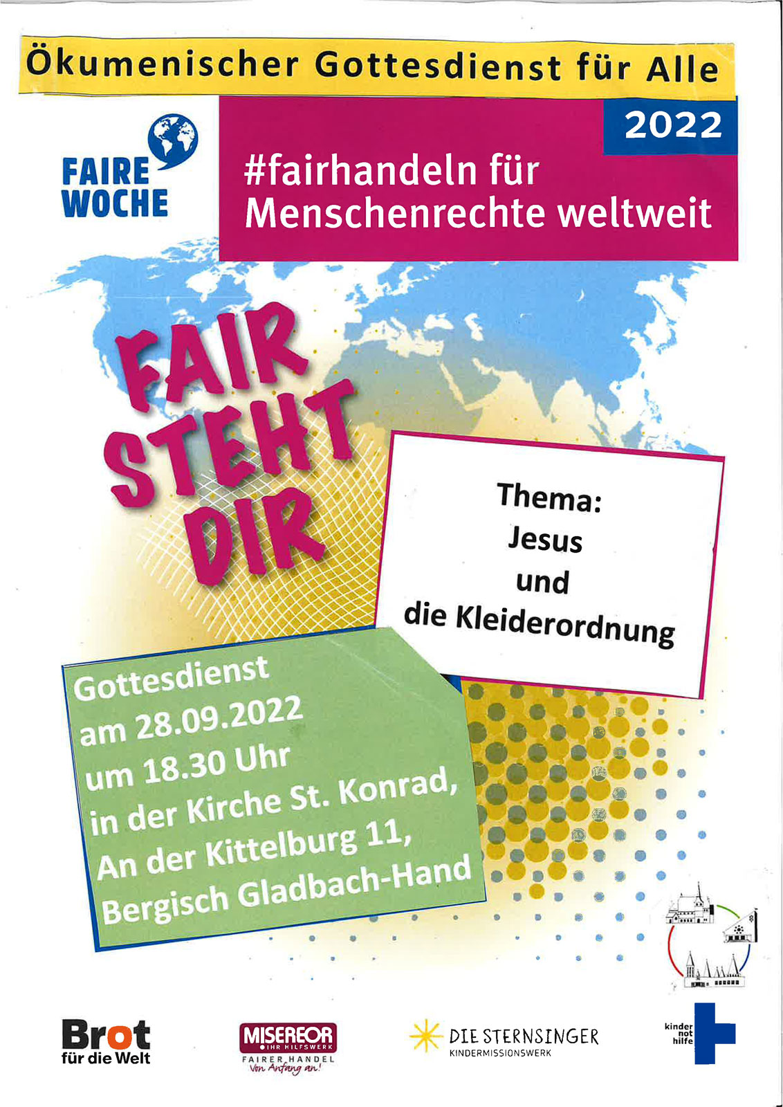 „Fairen“ Gottesdienst der Pfarreiengemeinschaft Bergisch Gladbach West in der Kath. Kirche St. Konrad in Hand am 28.9., 18:30.