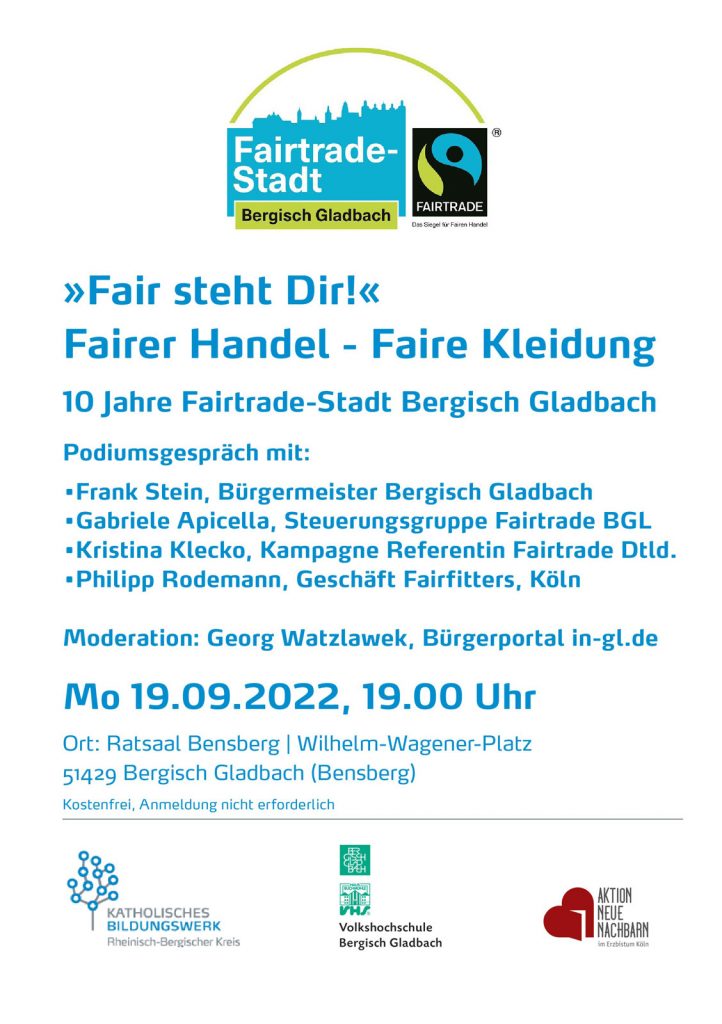 Für heute Abend laden die Steuerungsgruppe und das Kath. Bildungswerk zu einem Podiumsgespräch in den Ratssaal Bensberg ein. Unter dem Titel Fair steht Dir! Fairer Handel – Faire Kleidung diskutieren die Podiumsgäste Bürgermeister Frank Stein, Gabriele Apicella, Kristina Klecko und Philipp Rodemann darüber, was fairer Textilhandel bedeutet, wie wir als Verbraucher beitragen können, was die Stadt leistet – und was sie in Zukunft dafür tun könnte? Moderator des Abends ist Georg Watzlawek vom iGL-Bürgerportal.