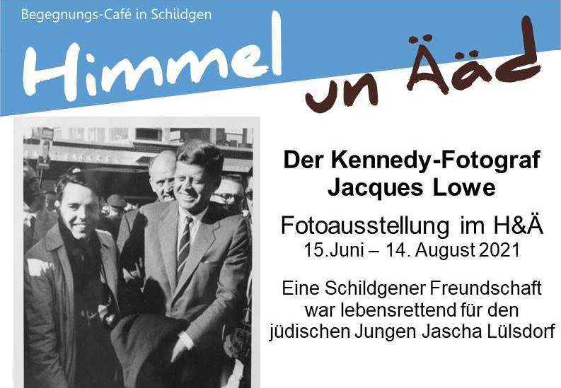 Im vergangenen Sommer gab’s im „Himmel un Ääd“ eine besondere Ausstellung mit Bildern des Kennedy-Fotografen und -Freundes Jacques Lowe, der als jüdischer Junge in Schildgen vor den Nazis versteckt und einer der bekanntesten Portraitfotografen Amerikas wurde. Die Ausstellungsfotos wurden von der Jacques-Lowe-Foundation in den USA in hochwertiger Qualität gedruckt und H&Ä für die Ausstellung zugesandt – mit der Freigabe, sie anschließend für die gemeinnützige Arbeit von „Himmel un Ääd“ gegen angemessene Spende an Interessierte abzugeben.