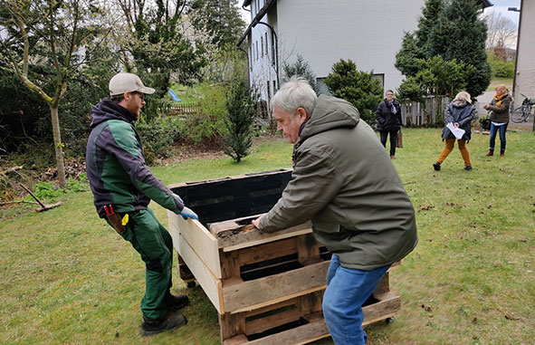 Das selbstgebaute Hochbeet wurde befüllt. Die Kinder vom Familienzentrum werden es bemalen und bepflanzen. Duftkräuter wurden schon gespendet. Auch erste Beerensträucher wurden eingepflanzt und Kapuzinerkresse ausgesät. Und einen Komposthaufen gibt es auch schon.