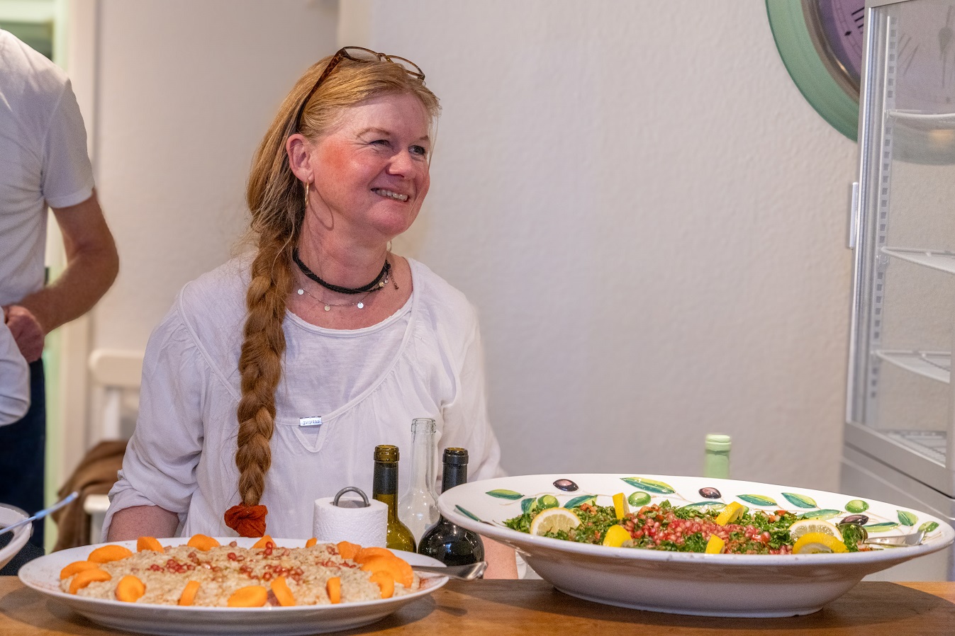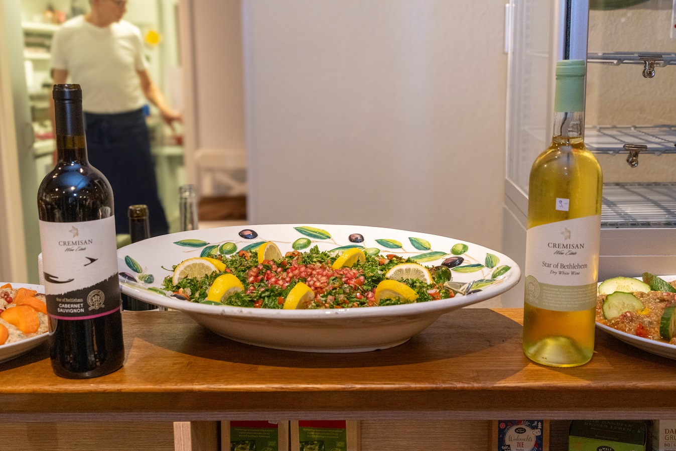 Die Vorspeisen waren wunderbar, ebenso die Hauptgerichte Reis mit Lamm, Bohnen in Tomatensoße, Auberginen und Feta. Dazu den passenden Wein „Cremisan – Star of Bethlehem“. Anschließend gab´s