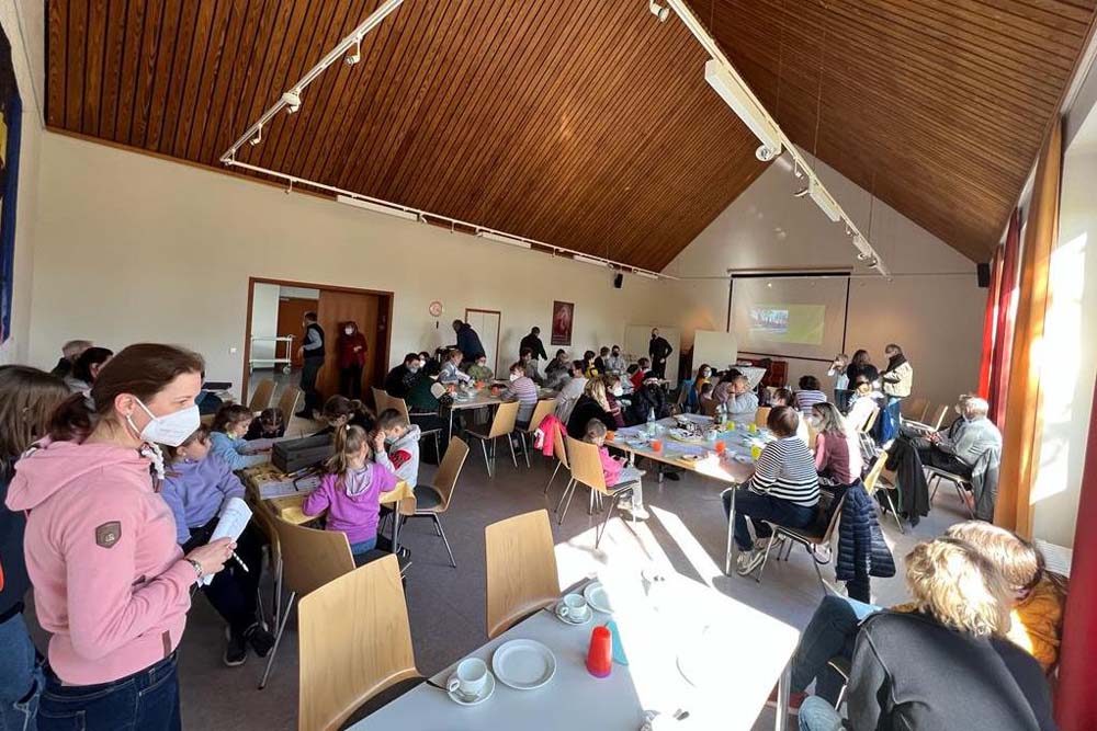 Insbesondere war es uns wichtig zu erfahren, wer an einem Deutsch-Kurs hier vor Ort in Schildgen teilnehmen möchte. Eva Jesse, die auch schon in den vergangenen Jahren mit ihrem Team ehrenamtlicher Deutschlehrer:innen in Schildgen Sprachkurse durchgeführt hat, stellte sich vor. Wir möchten es gerne so organisieren, dass parallel zum Kurs auch eine Kinderbetreuung möglich ist. Entsprechende Räumlichkeiten werden uns wieder – wie in vergangenen Jahren – von der Pfarrgemeinde Herz Jesu zur Verfügung gestellt.