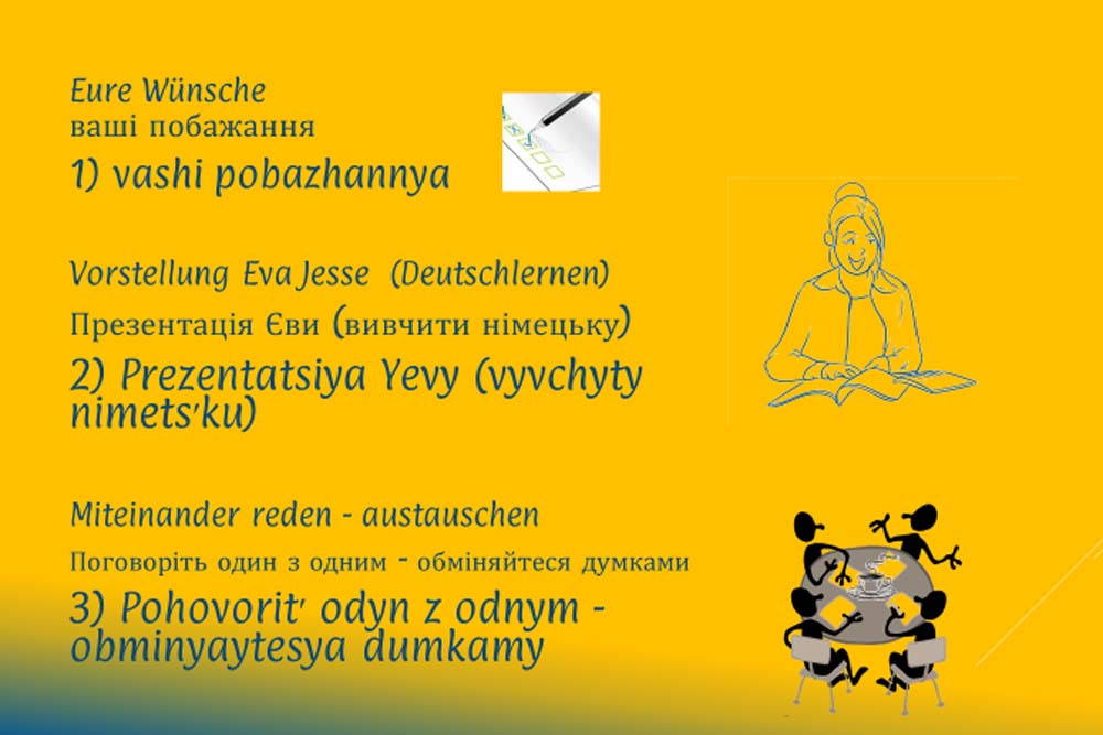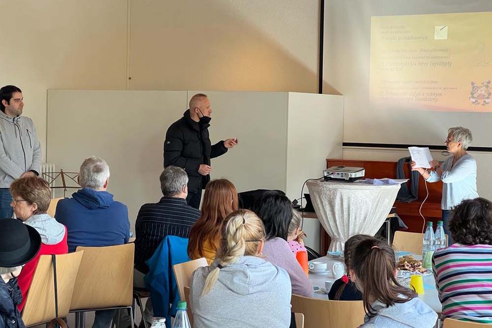 Bei Kaffee, Kaltgetränken und Kuchen fand ein reger und informativer Austausch statt. Auch haben wir unsere Gäste gebeten, ihre Wünsche und Bedarfe auf einem vorbereiteten Fragebogen (dt./ukrainisch) aufzuschreiben.