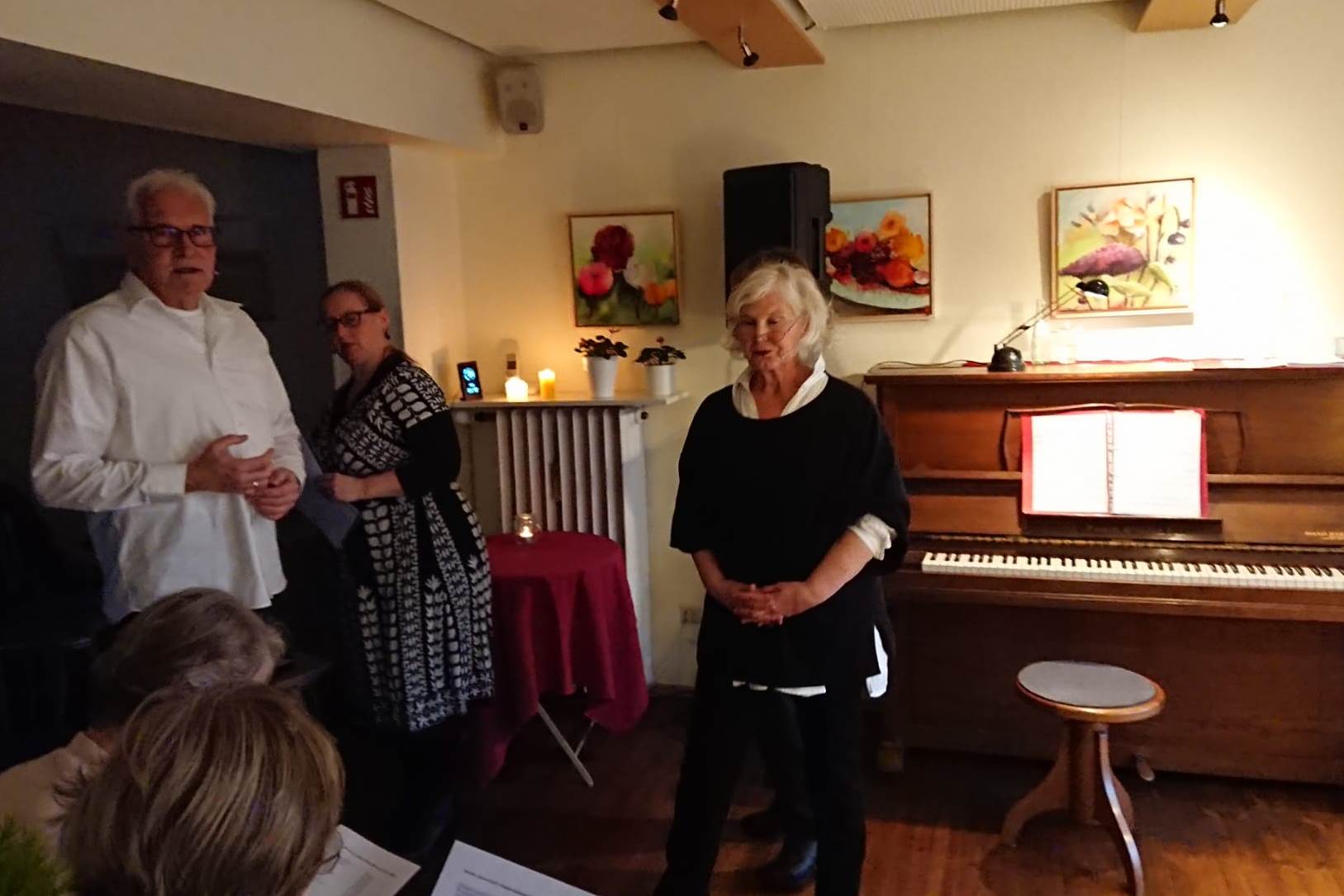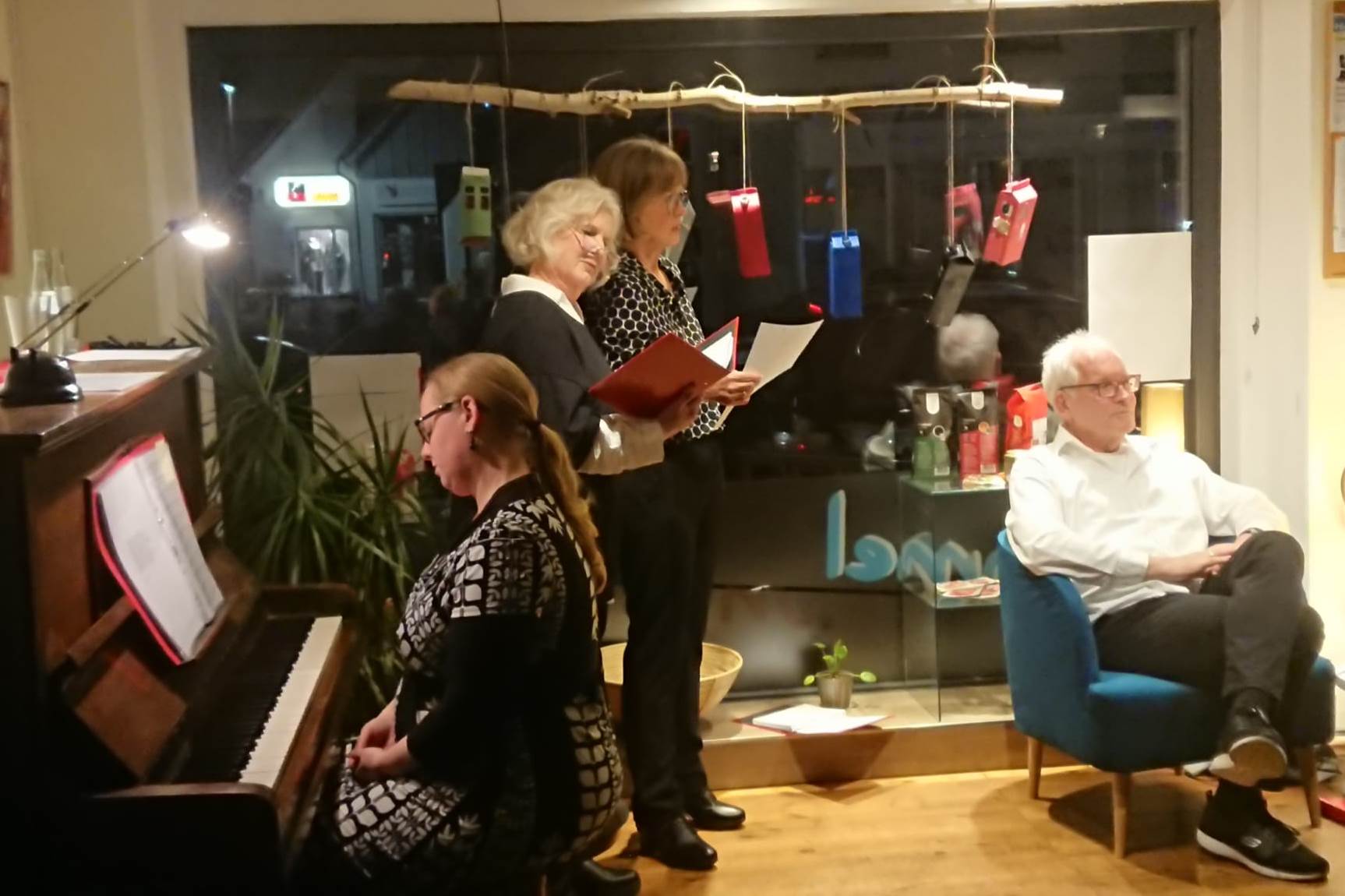 Susanne war eine wunderbar entspannte Gastgeberin und knapp 30 Leute hatten viel Freude an den Gedichten und Liebesbriefen von Heinrich Heine und Kurt Tucholsky. Es war zu erkennen, dass so einige die Texte in Gedanken mitgesprochen haben. Unsere ausgelegten Gedichtlisten wurden zum großen Teil mitgenommen – ein Kompliment an das interessierte Publikum. Bettina, unsere Pianistin hat sich über das gut gestimmte Klavier gefreut. Es war uns ein Vergnügen!!! Wir kommen gerne wieder.“ Carola Garbe-Brestowsky für Mimento.