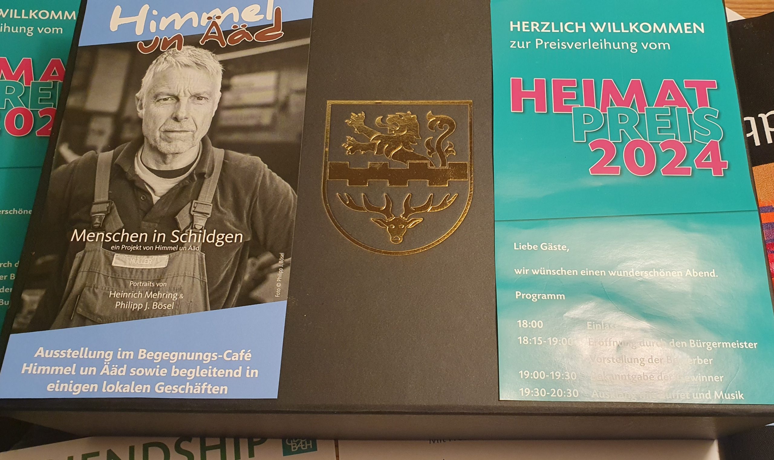 Mit unserem fotografischen Heimatprojekt „Menschen in Schildgen“   – die Ausstellung mit 56 Portraits war im Frühjahr 2024 zu sehen im Himmel un Ääd-Café und in vielen Schildgener Schaufenstern – hatten wir uns gemeinsam mit den beiden Fotografen Heinrich Mehring und Philipp J. Bösel auch um den diesjährigen Heimatpreis beworben.