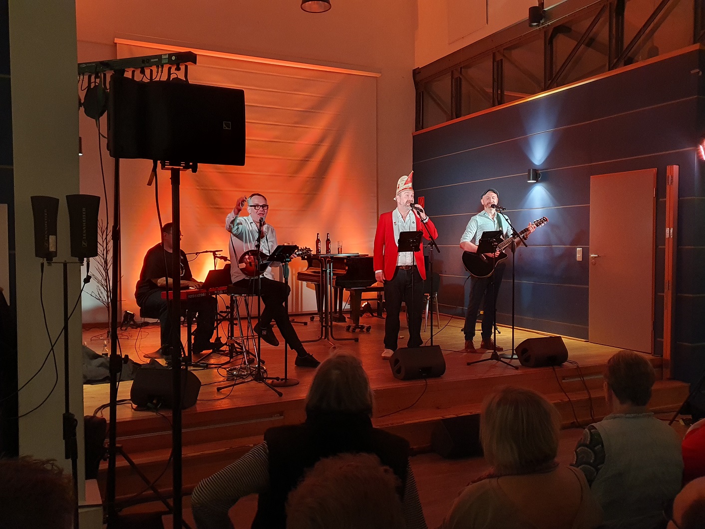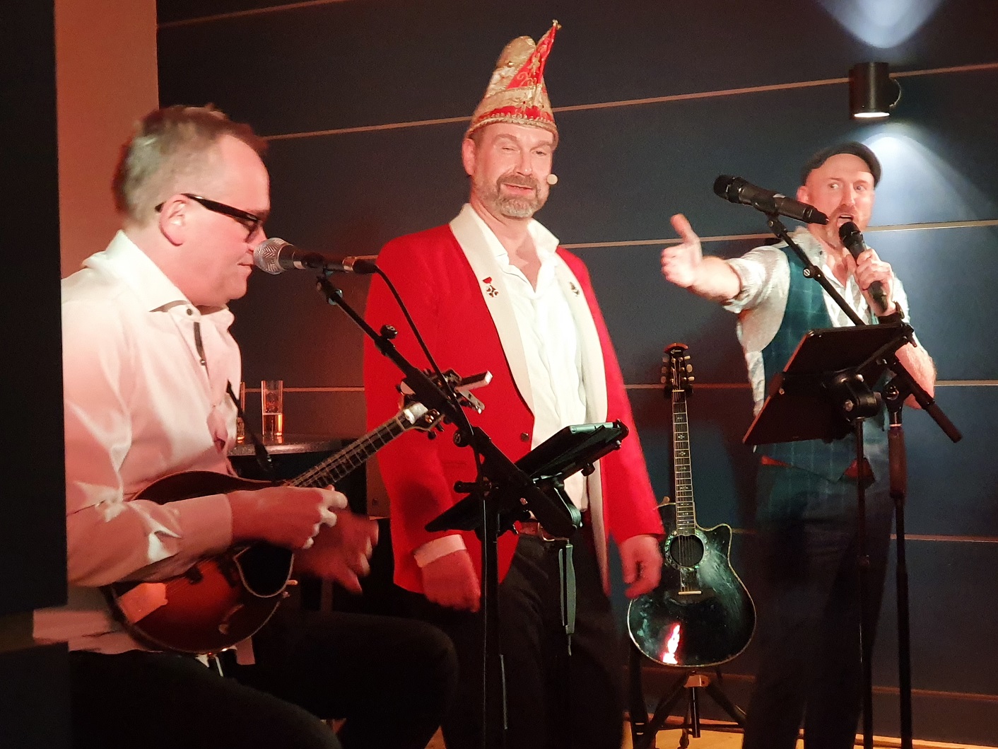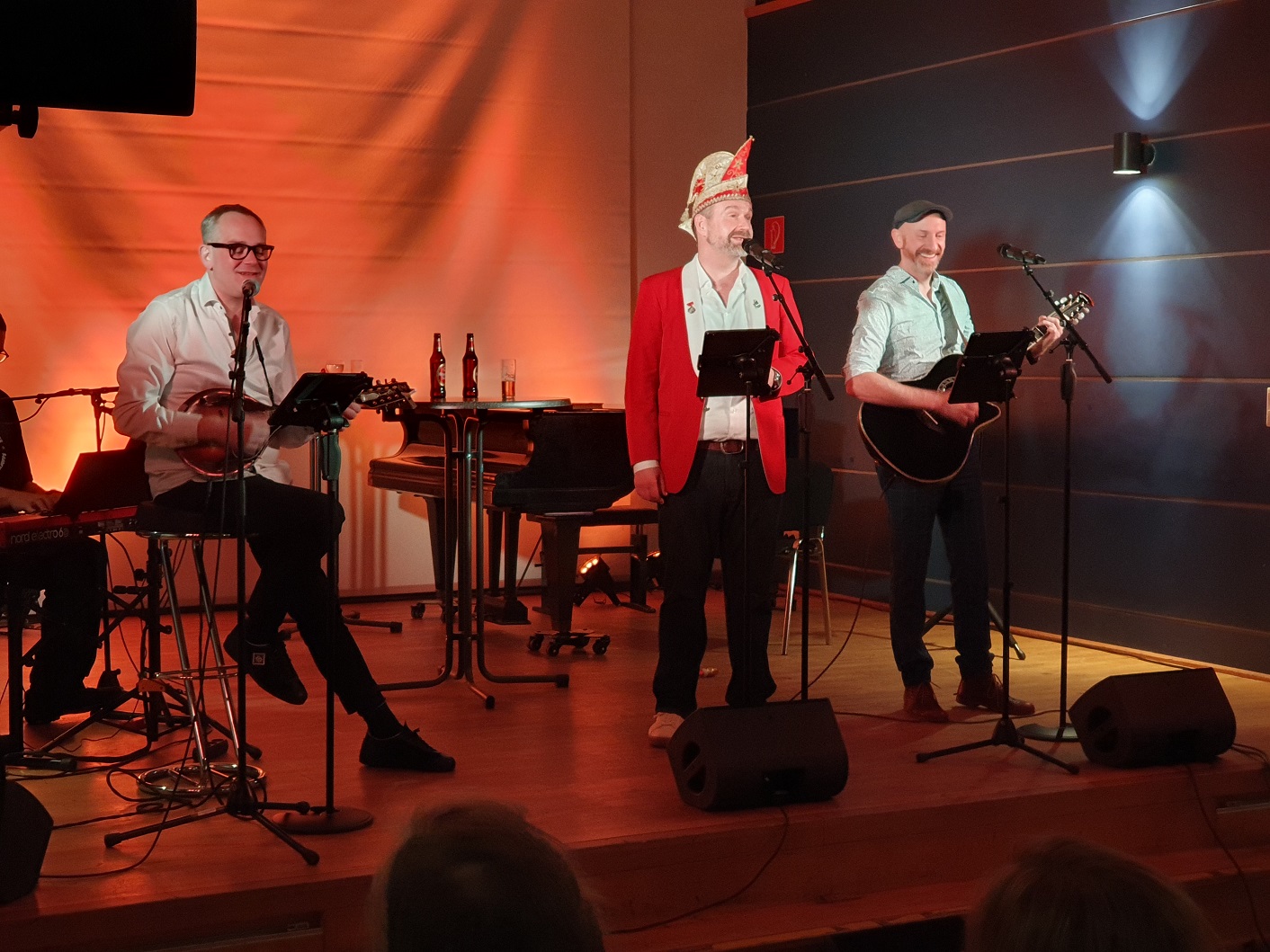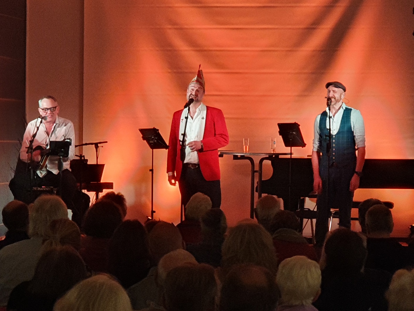 Martin Schopps, der bekannte Karnevalsredner, JP Weber mit seiner Flitsch und Volker Weininger, „Der Sitzungspräsident“, brachten mit ihrem aktuellen Programm eine Wahnsinnsstimmung in den ausverkauften Pfarrsaal. Begleitet wurde das Trio am Piano von Michael „Knippi“ Knipprath.