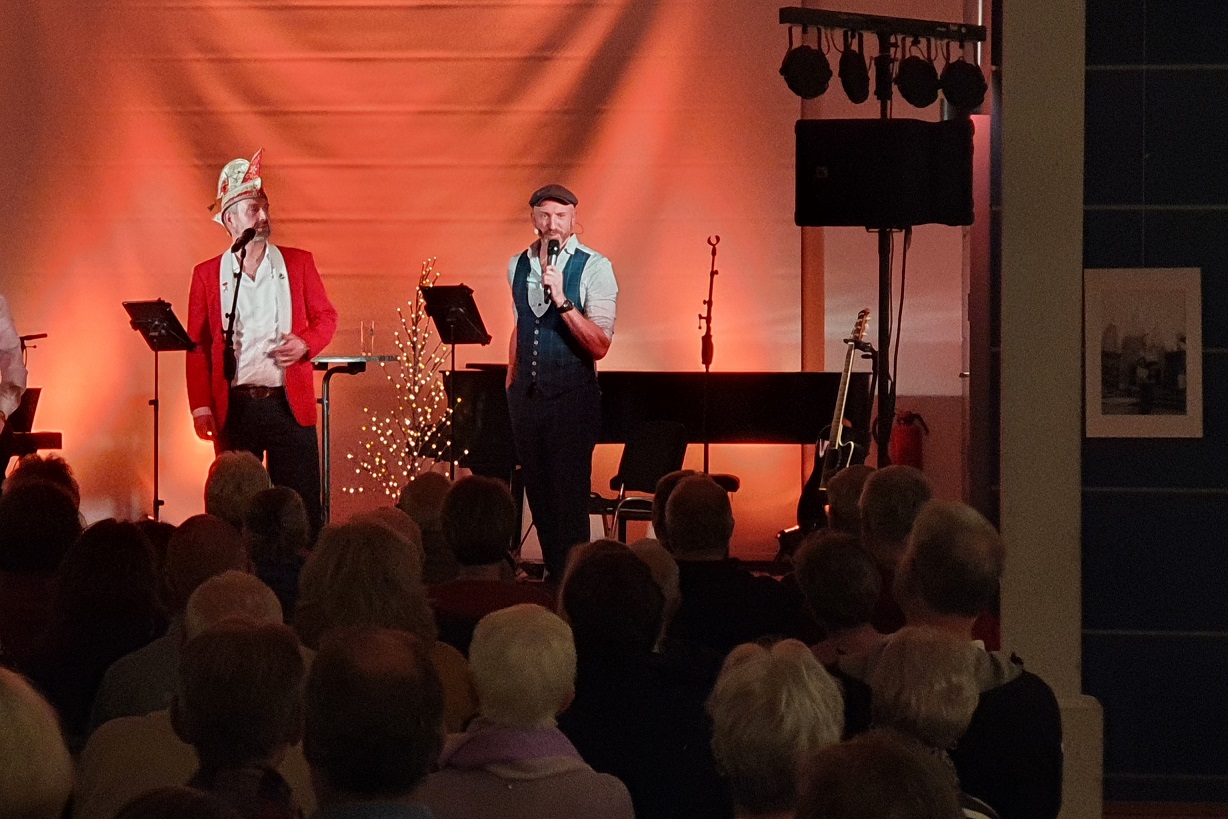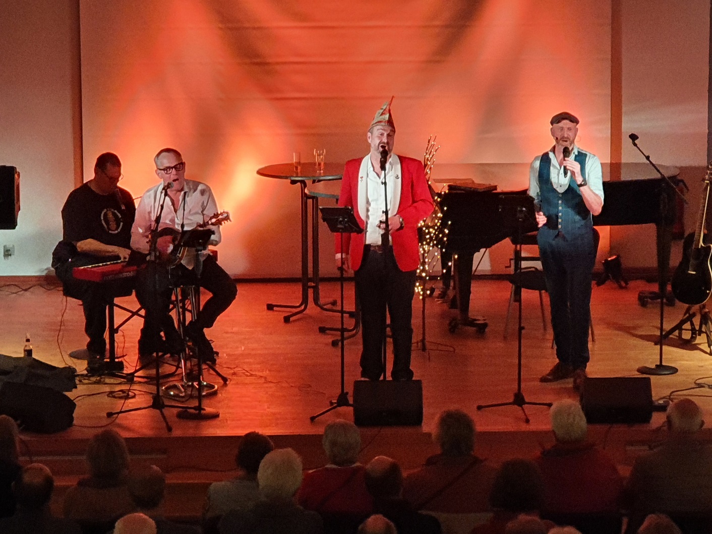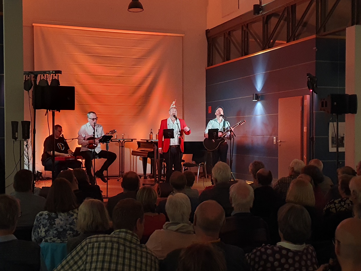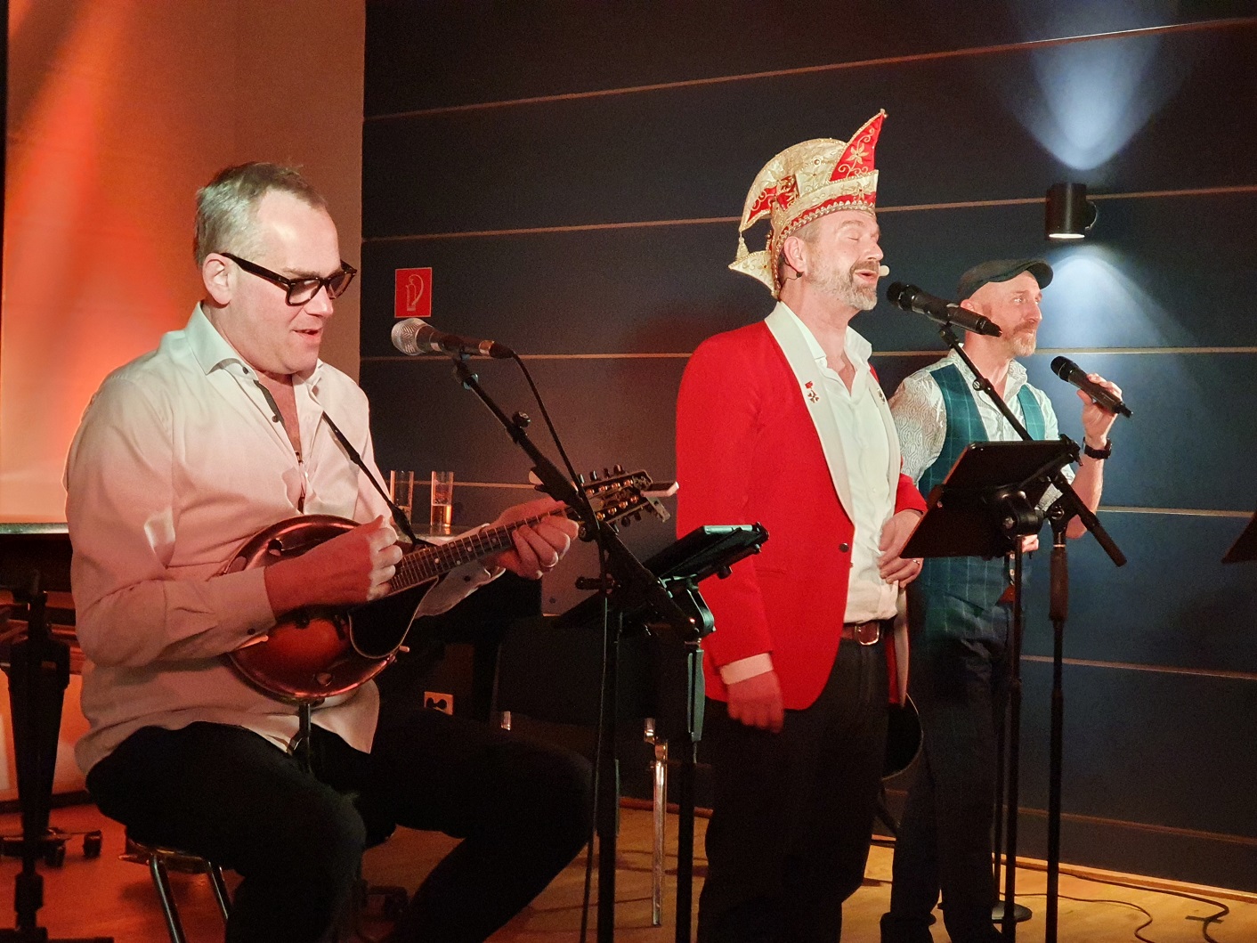Martin Schopps, der bekannte Karnevalsredner, JP Weber mit seiner Flitsch und Volker Weininger, „Der Sitzungspräsident“, brachten mit ihrem aktuellen Programm eine Wahnsinnsstimmung in den ausverkauften Pfarrsaal. Begleitet wurde das Trio am Piano von Michael „Knippi“ Knipprath.