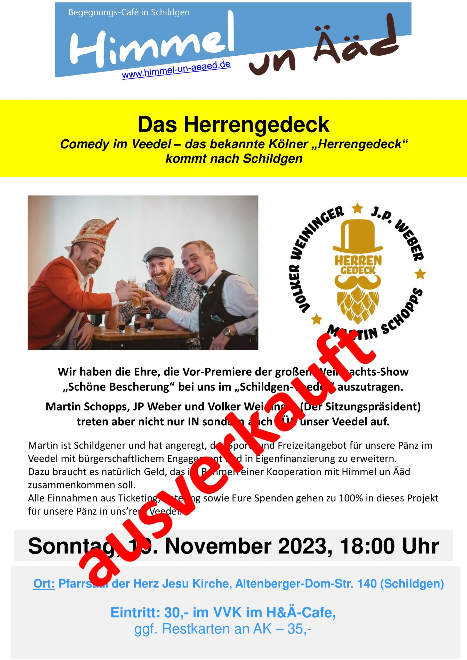 „Es war für uns ein großartiger Abend. Wir hatten total viel Spaß mit unserem super Vor-Premieren Publikum hier in Schildgen. Ich bin echt überglücklich, dass das Programm so gut angenommen wurde und werde versuchen, meine beiden Freunde vom Herrengedeck zu überreden, dass wir die nächste Vor-Premiere wieder in unserem Veedel machen. Jetzt heißt es aber erst 12 mal: „Schöne Bescherung“ in der Stadthalle Köln Mülheim. Vielen Dank, liebes Himmel un Ääd Team für die tolle Organisation und euer mega Engagement für Schildgen“.
