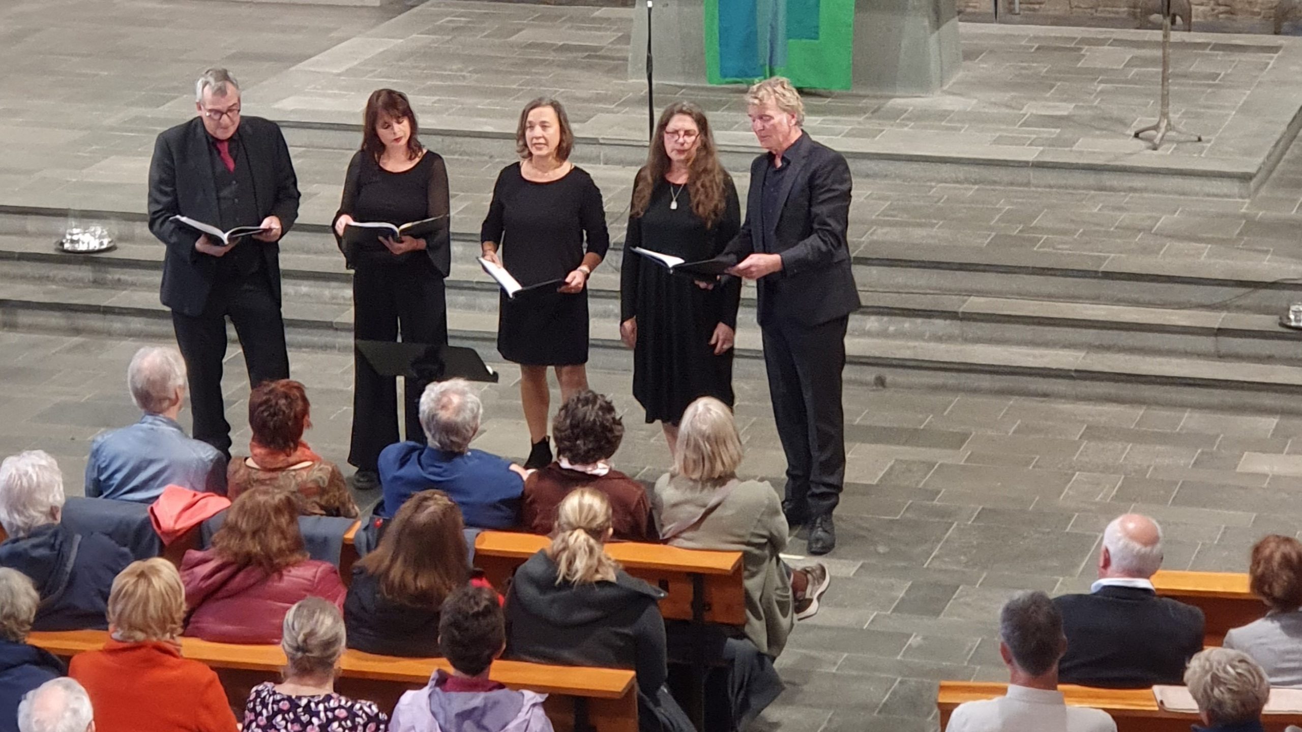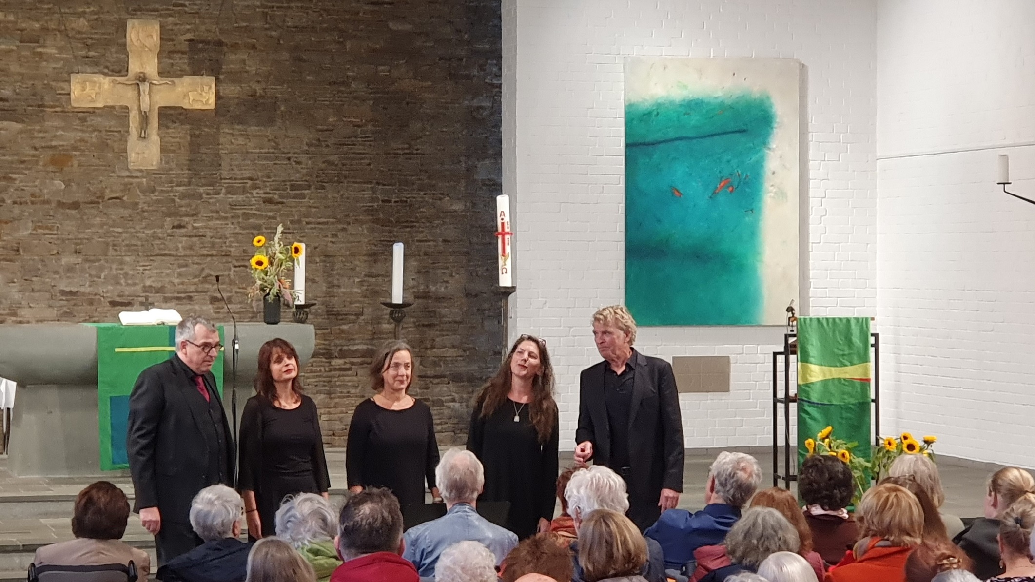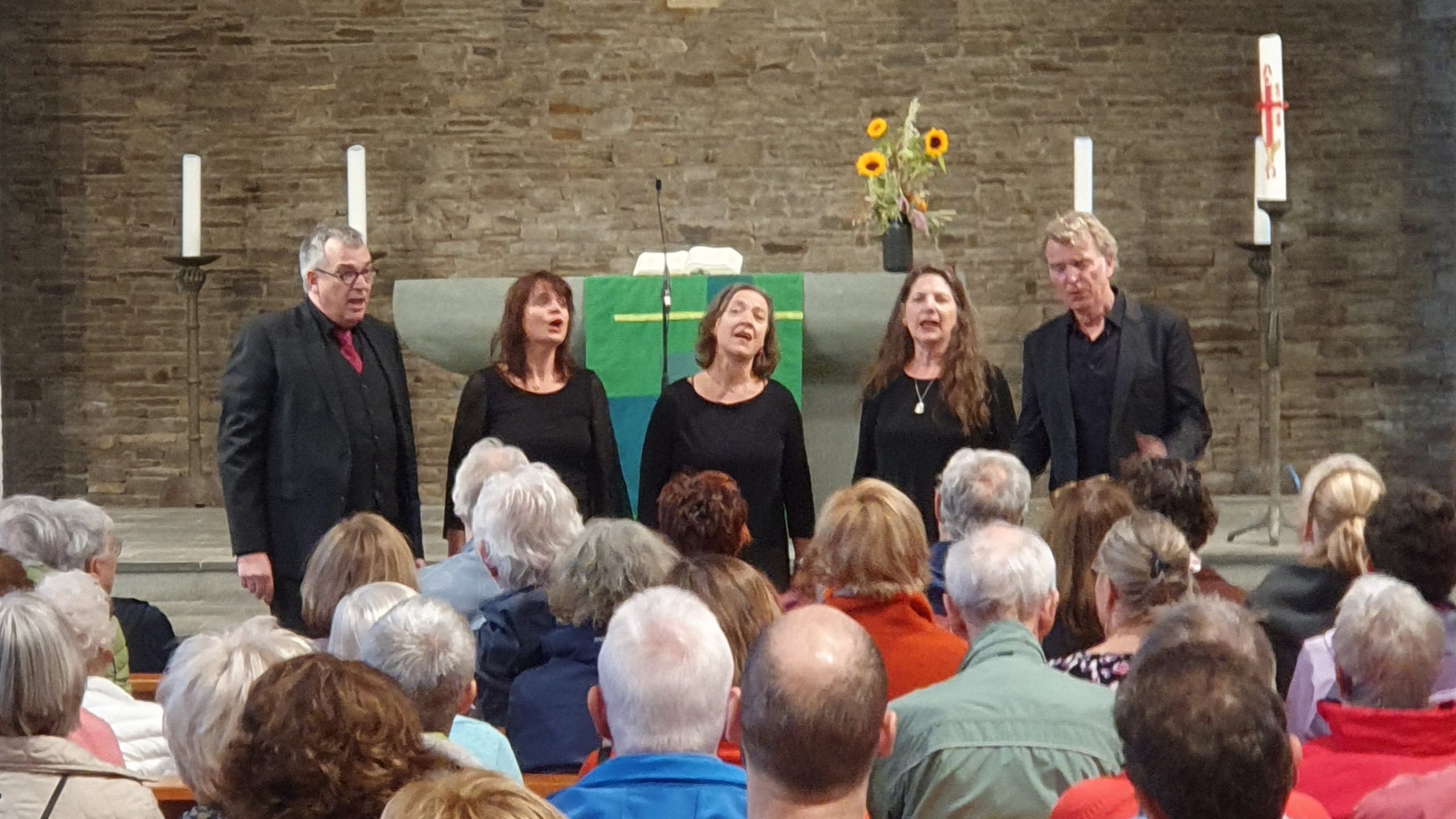 Das fünf-stimmige Vocal-Ensemble „5 grad“ aus Refrath präsentierte ein mitreißendes Programm in der vollbesetzten Andreaskirche, in der wir dankenswerterweise zu Gast sein konnten.