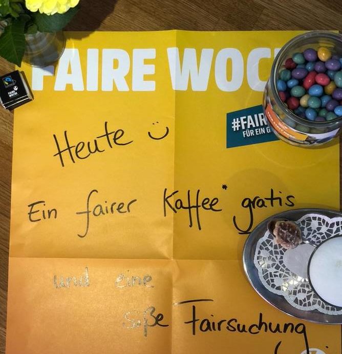 Gratis eine faire Kaffeespezialität und eine süße FAIRsuchung sowie Information und Gespräch im H&Ä – anlässlich der diesjährigen deutschlandweiten „Fairen Woche“ vom 11. bis 25. September, die diesmal unter dem Motto „Fair statt mehr“ steht.