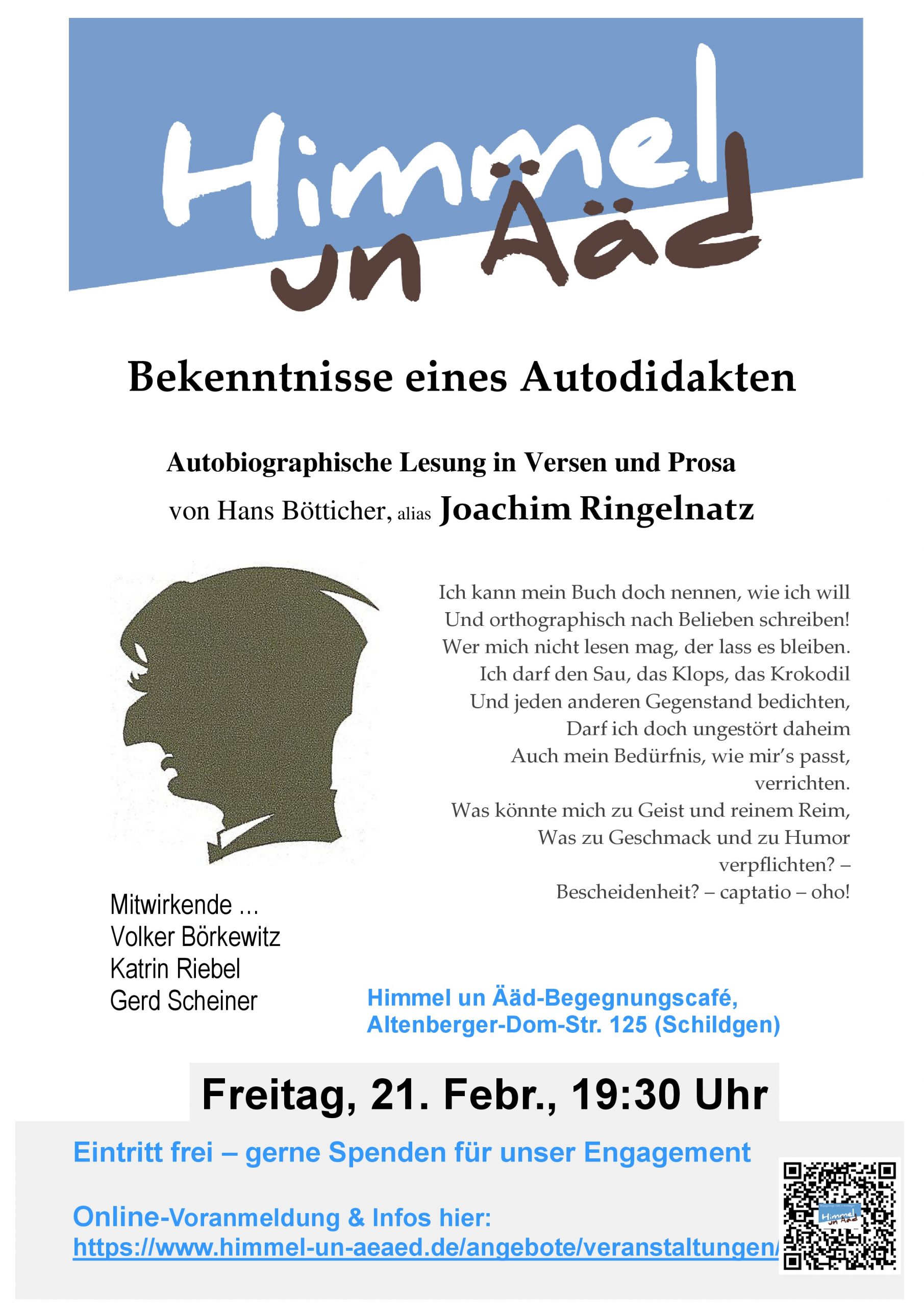 Bekenntnisse eines Autodidakten – Ringelnatz: eine autobiographische Lesung, eine spannende Krimilesung mit dem Schildgener Autor und Hörbuchpreisträger Thomas Krüger,  und zur Entspannung Sport & Spiel.