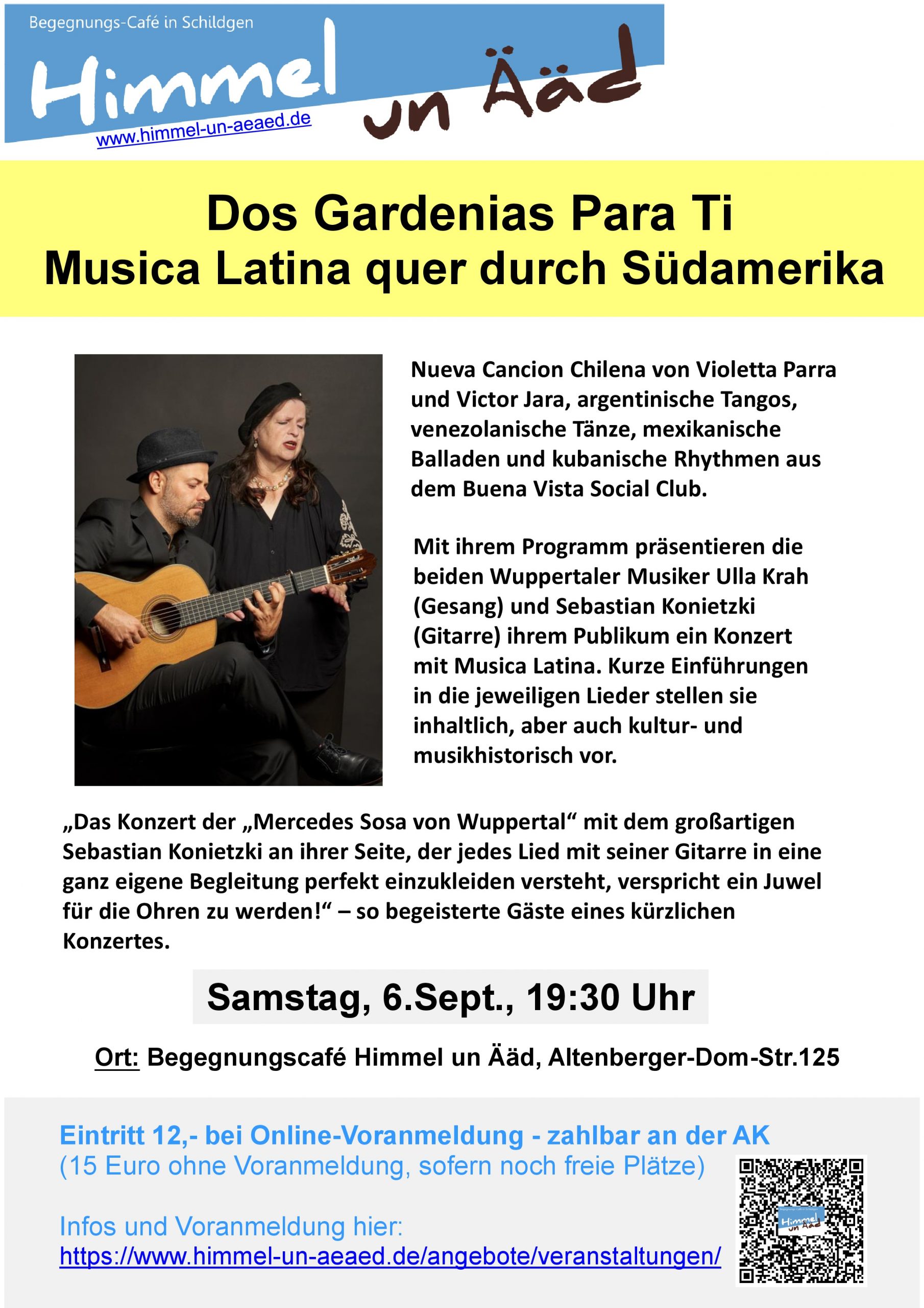 Mit ihrem Programm präsentieren die beiden Wuppertaler Musiker Ulla Krah (Gesang) und Sebastian Konietzki (Gitarre) ihrem Publikum ein Konzert mit Musica Latina. Kurze Einführungen in die jeweiligen Lieder stellen sie inhaltlich, aber auch kultur- und musikhistorisch vor.