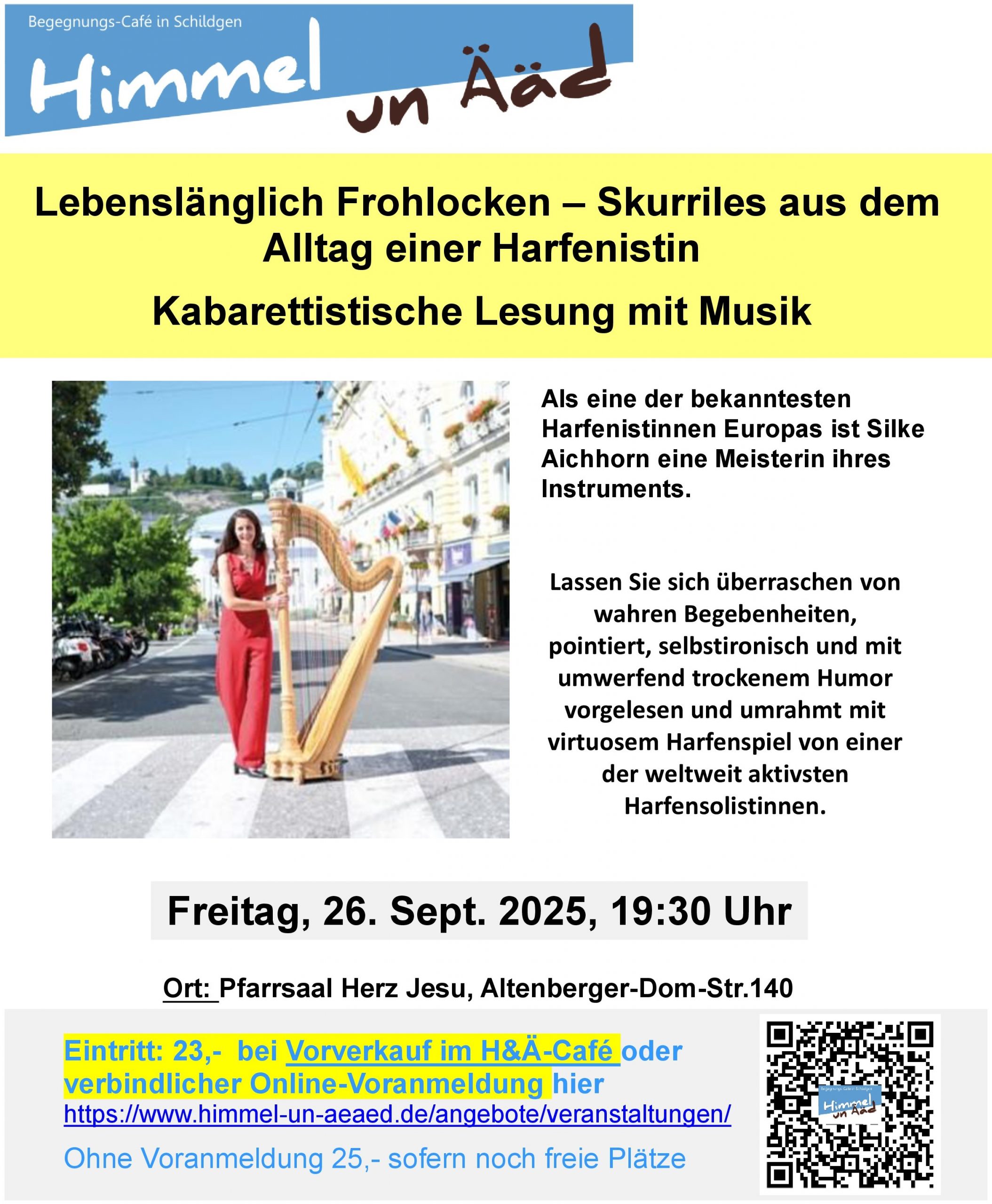 Ein Höhepunkt im diesjährigen H&Ä-Veranstaltungsprogramm ist der Abend mit der international renommierten Soloharfenistin Silke Aichhorn und ihrem Programm „Lebenslänglich Frohlocken – Skurriles aus dem Alltag einer Harfenistin“. Heinz D. Haun gastiert mit dem bereits mit dem Kulturpreis „Der Bopp 2023“ des Stadtverbandes Kultur ausgezeichnetem szenischen Hörspiel „Die Innenseite des Glücks – Pius und Helene 1939–1949“ in Schildgen. Argentinische Tangos, venezolanische Tänze, mexikanische Balladen und kubanische Rhythmen aus dem Buena Vista Social Club präsentieren die beiden Wuppertaler Musiker Ulla Krah (Gesang) und Sebastian Konietzki (Gitarre). Im Rahmen der Seniorenkulturwoche 2025 gibt´s einen märchenhaften Abend mit dem Rheinischen Märchenkreis.