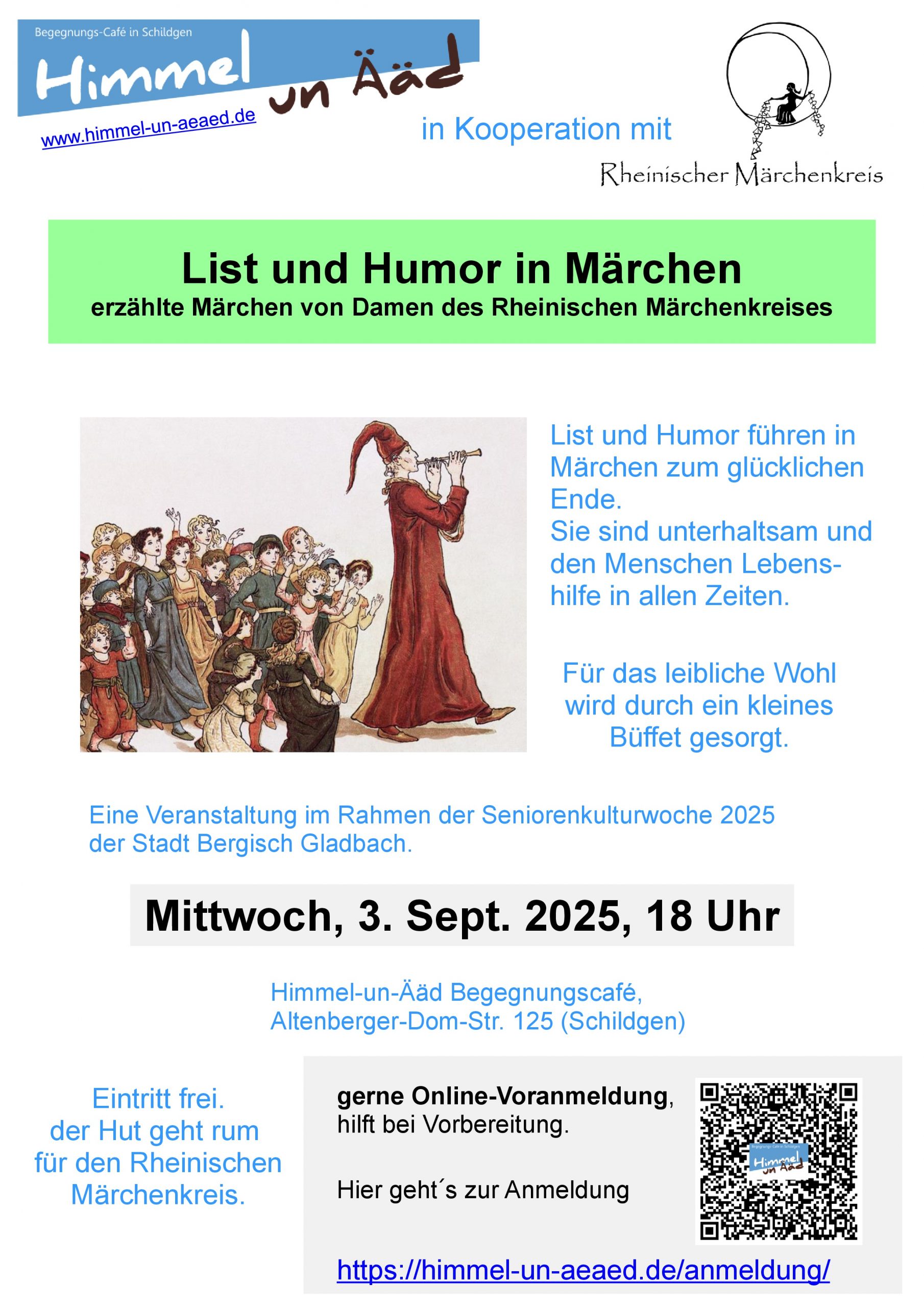 Ein Märchen-Abend mit dem Rheinischen Märchenkreis – im Rahmen der Seniorenkulturwoche 2025 der Stadt Bergisch Gladbach.6.9. (Sa.), 19:30