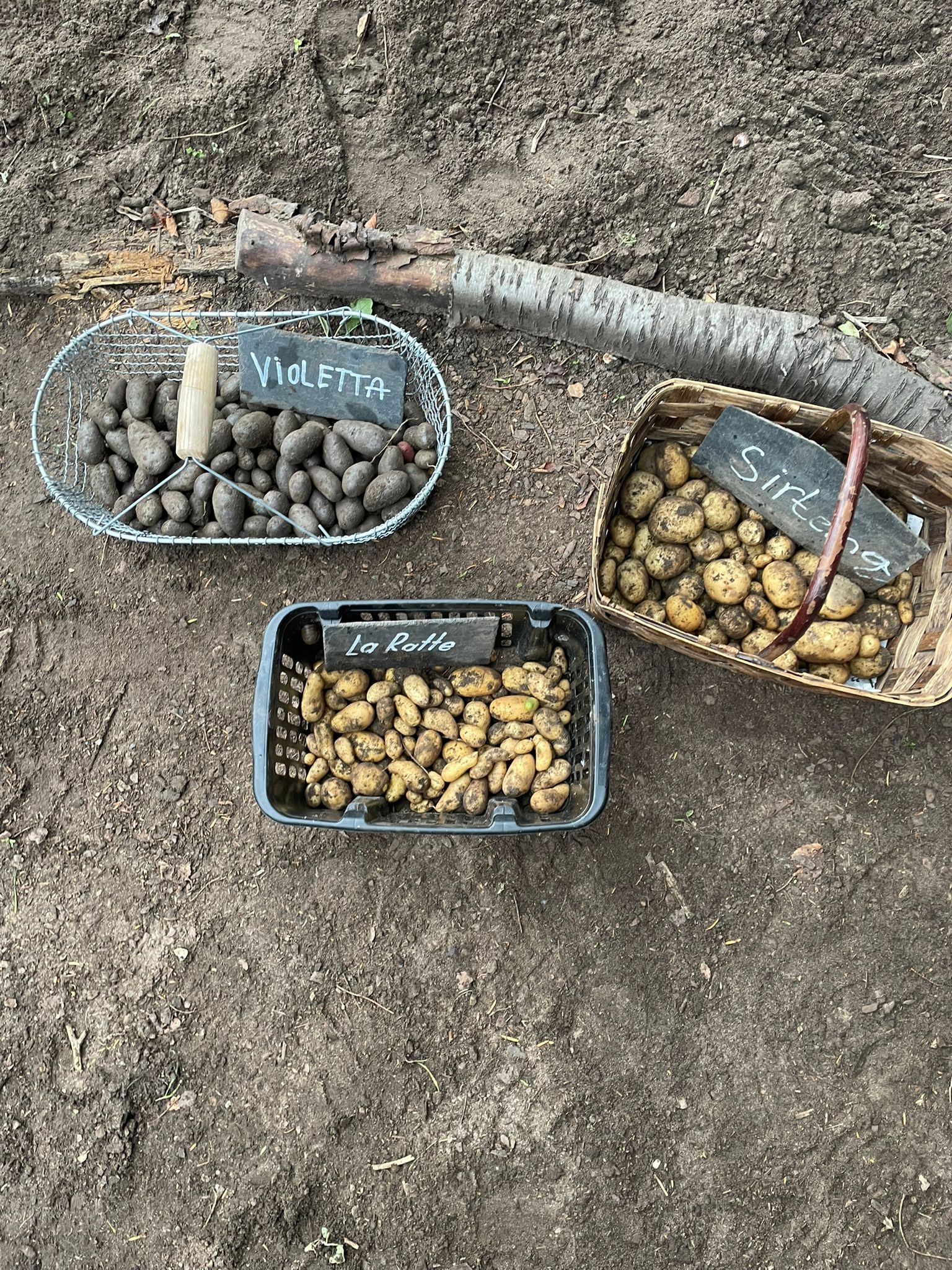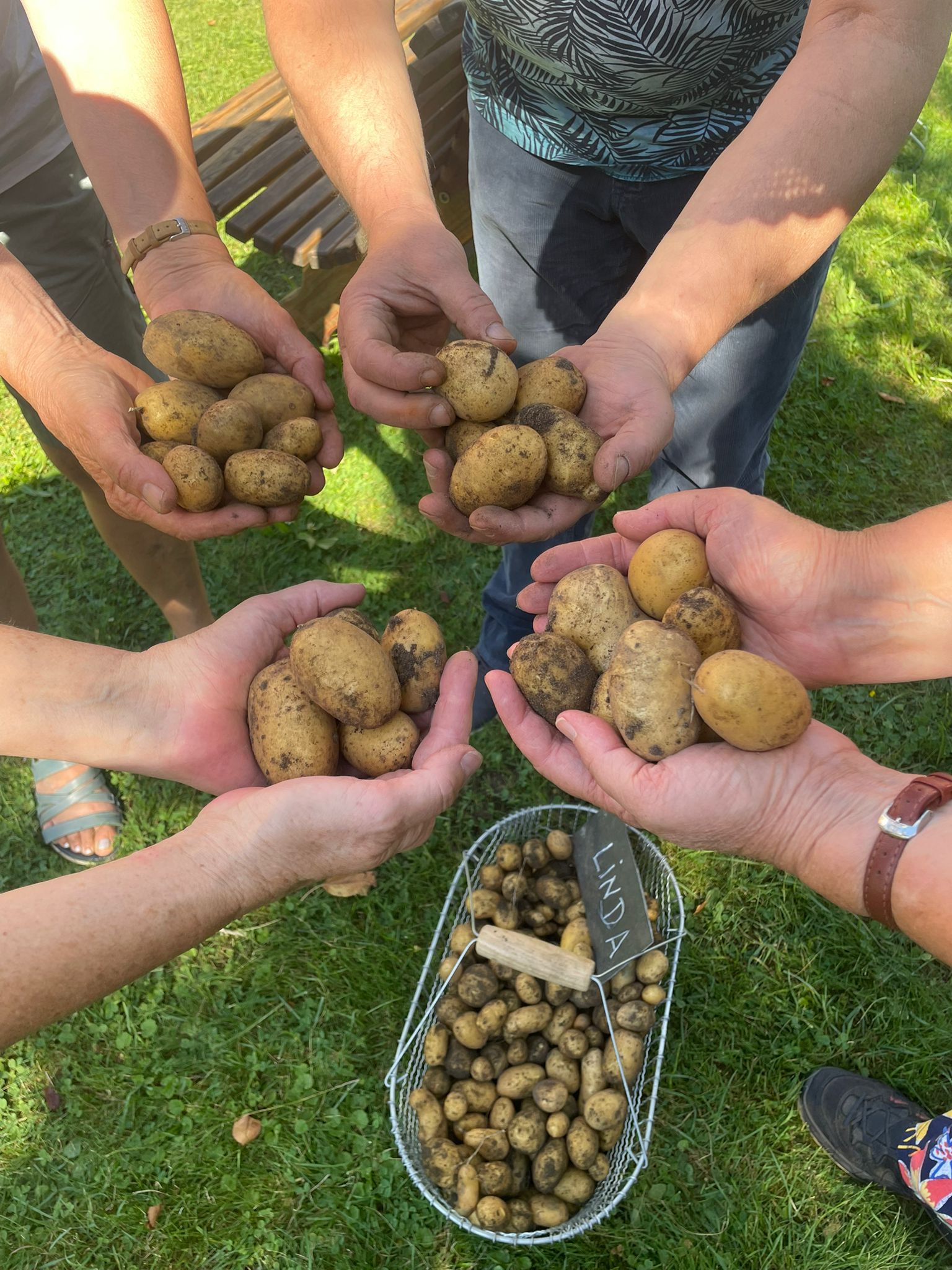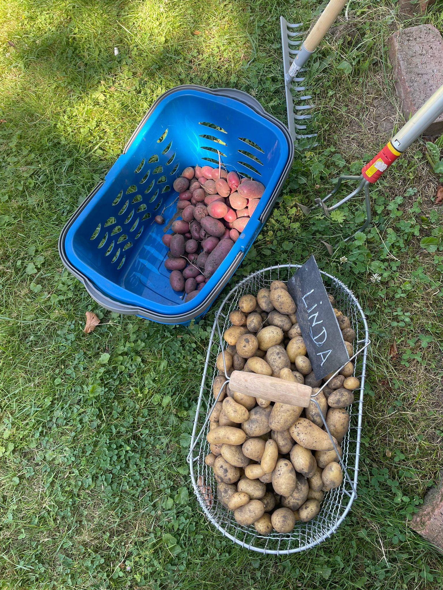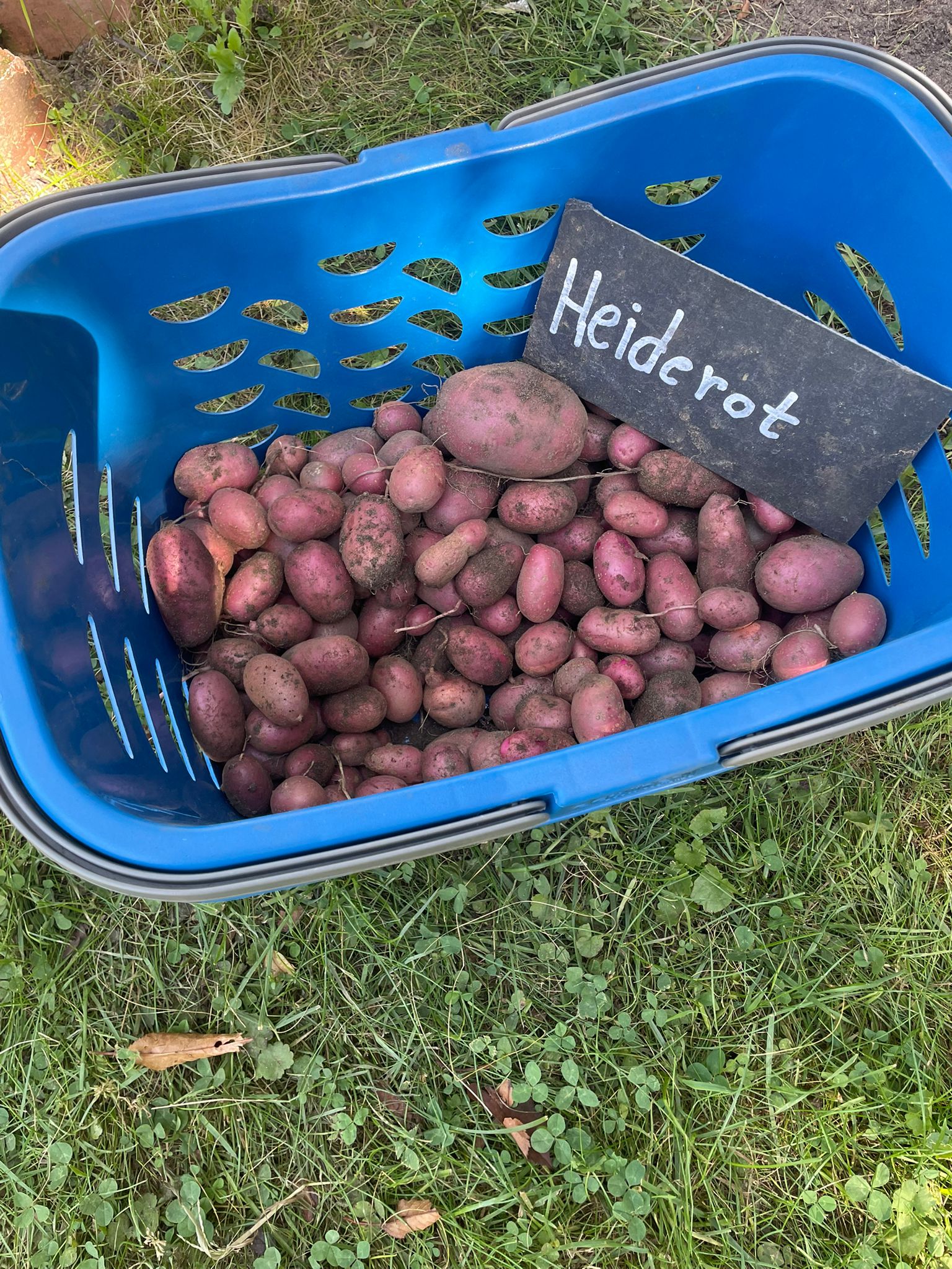 Nachdem wir im Frühjahr die Saatkartoffeln gemeinsam in die Erde gesetzt und über den Sommer „gepflegt“ hatten, waren wir nun alle gespannt auf unser „Ergebnis“.Wir ernteten die Sorten: Heiderot, Linda, La Roche, Sirtema und Violetta.