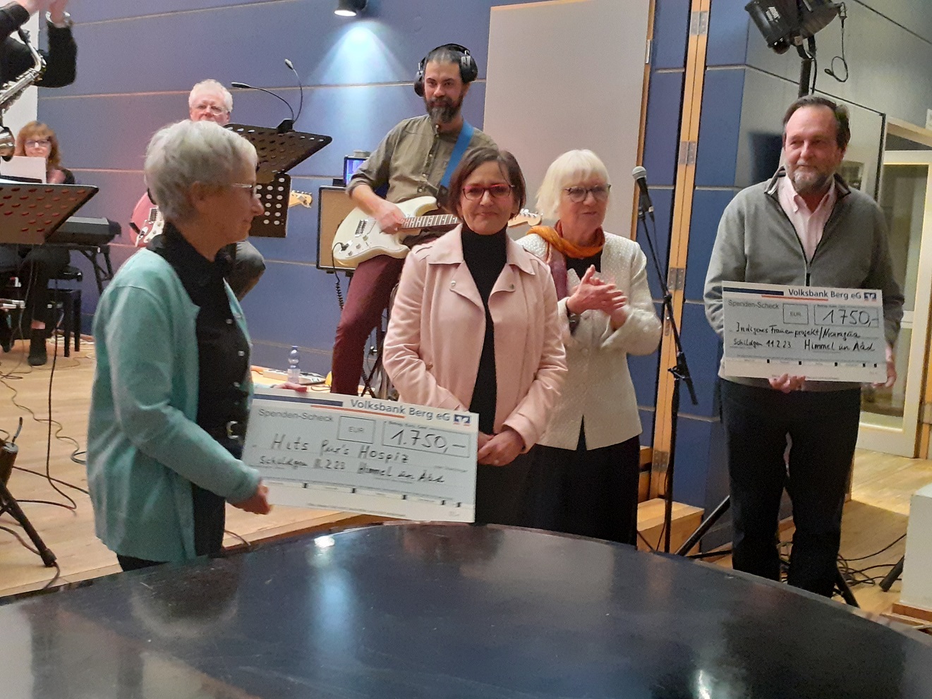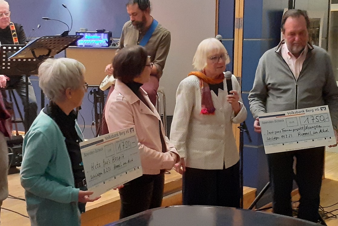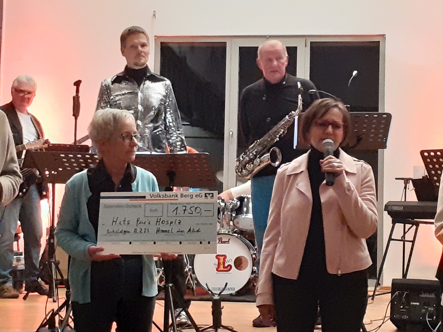 In der Pause konnten wir vom H&Ä-Team den Vertreterinnen unserer beiden letzten Quartalsprojekte den symbolischen Spendenscheck in Höhe von jeweils 1.750 Euro überreichen. Gabi Schillinger, die Leiterin Förderprojekte von Hits fürs Hospiz e.V. und Sabine Schiek für ein indigenes Frauenprojekt in Nicaragua freuten sich sehr und berichteten kurz darüber, wofür das Geld eingesetzt wird. Alles in allem ein gelungener Abend.