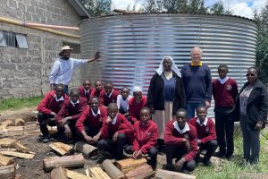 „Hallo Achim, viele Grüße aus Kenia, vor dem von euch finanzierten Wassertank mit der Schulleiterin, zwei Lehrkräften und SchülerInnen des German Clubs. Die Wasserversorgung der Schule und der kleinen Baumschule ist komplett gesichert“.