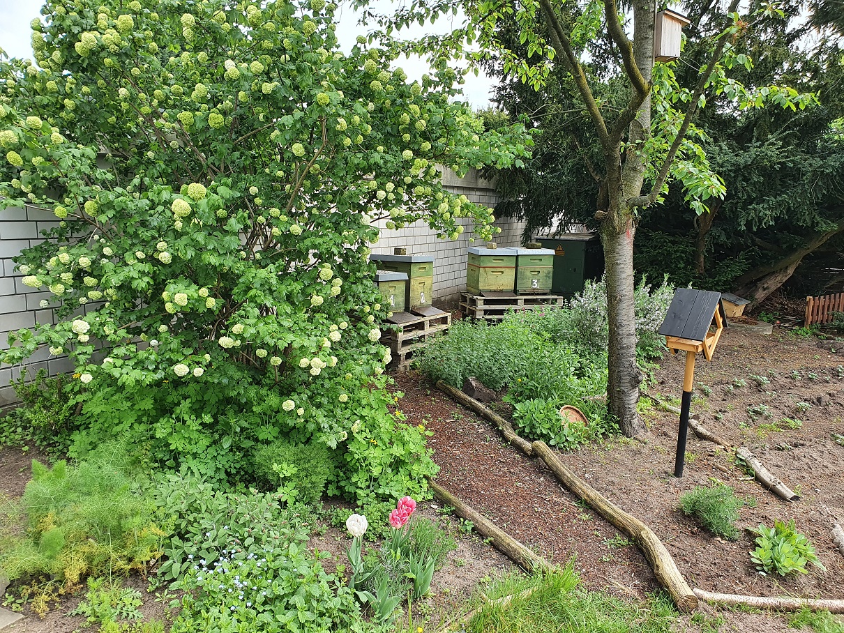 Alles steht in sattem Grün, es blüht, der Rhabarber sprießt, Obstbäumchen wurden gepflanzt, die Kartoffeln sind auch schon angehäufelt und die Bienen summen.